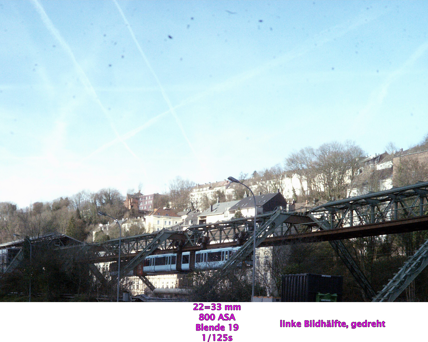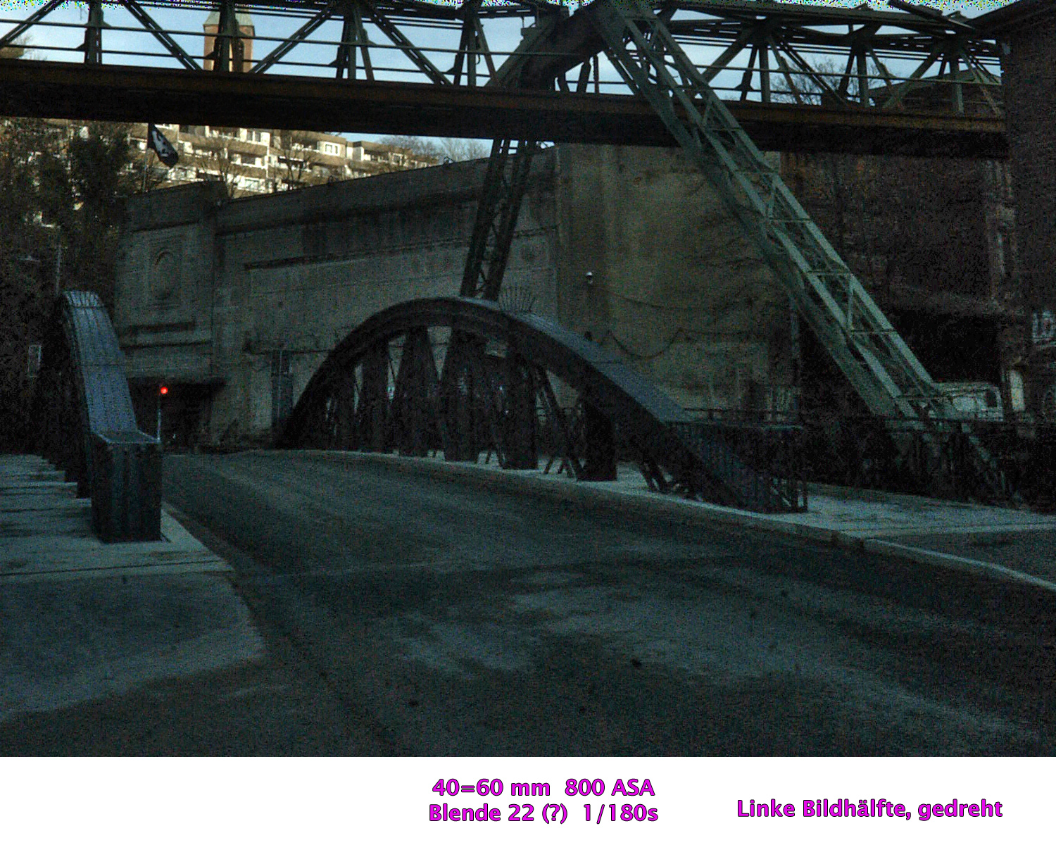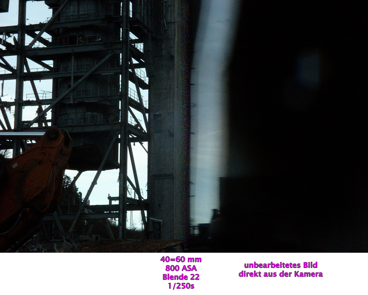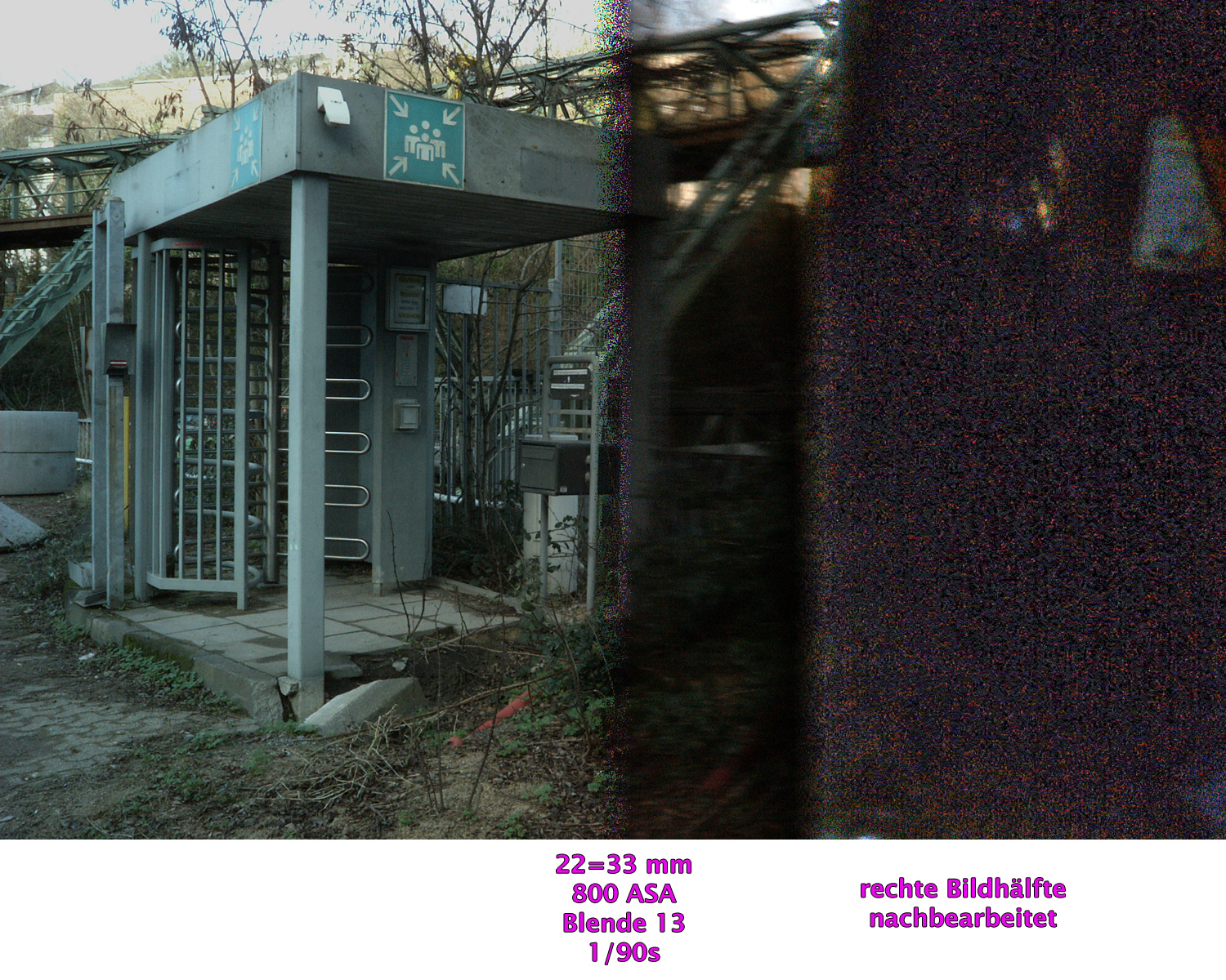 Die Übergangsstelle wird durch beide Sensoren erzeugt, darum erscheint sie bei 200 ASA-Aufnahmen mit einem sanftem Verlauf von Hell nach Dunkel, bei 800 ASA-Bildern wirkt sich das Sensorrauschen stärker aus, der Übergangsbereich ist mit bunten Pixeln durchsetzt, die von links nach rechts immer dunklere Farben haben. Die Stärke des Fehlerbildes ist bei meiner Kamera nicht bei jeder Aufnahme gleich, es scheint von der Objektivbrennweite abhängig zu sein, wie deutlich der Defekt hervortritt.