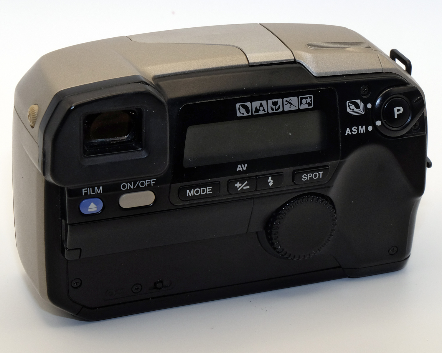 Der optische Sucher ist ziemlich klein, man merkt ihm an, daß er mit zwischengeschalteten Linsen sehr weit nach hinter versetzt werden mußte, man blickt quasi in einen Tunnel. Das schon nicht allzugroße APS-Bildfeld ist durch einen Rahmen verkleinert worden, um dem Cropfaktor der Relaisoptik zu entsprechen. Brillenträger können das unterhalb des Motivs angebrachten LCD-Feld mit diversen Belichtungsangaben-Angaben wie Blitzkontrolle, Belichtungszeit, Blende usw. meist nicht zusammen mit dem gesamtem Bildfeld einsehen, sondern müssen die Kamera vor dem Auge etwas verschieben.