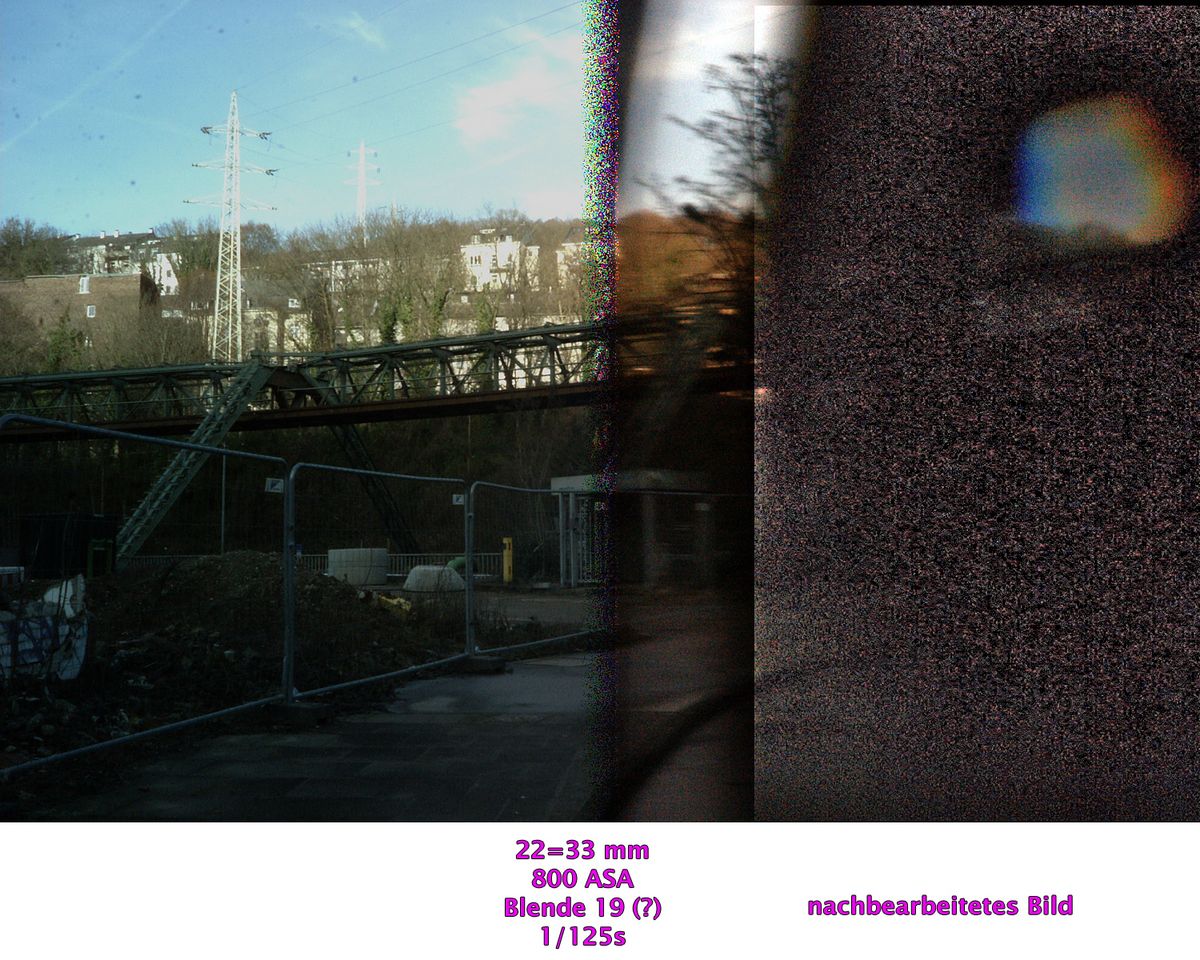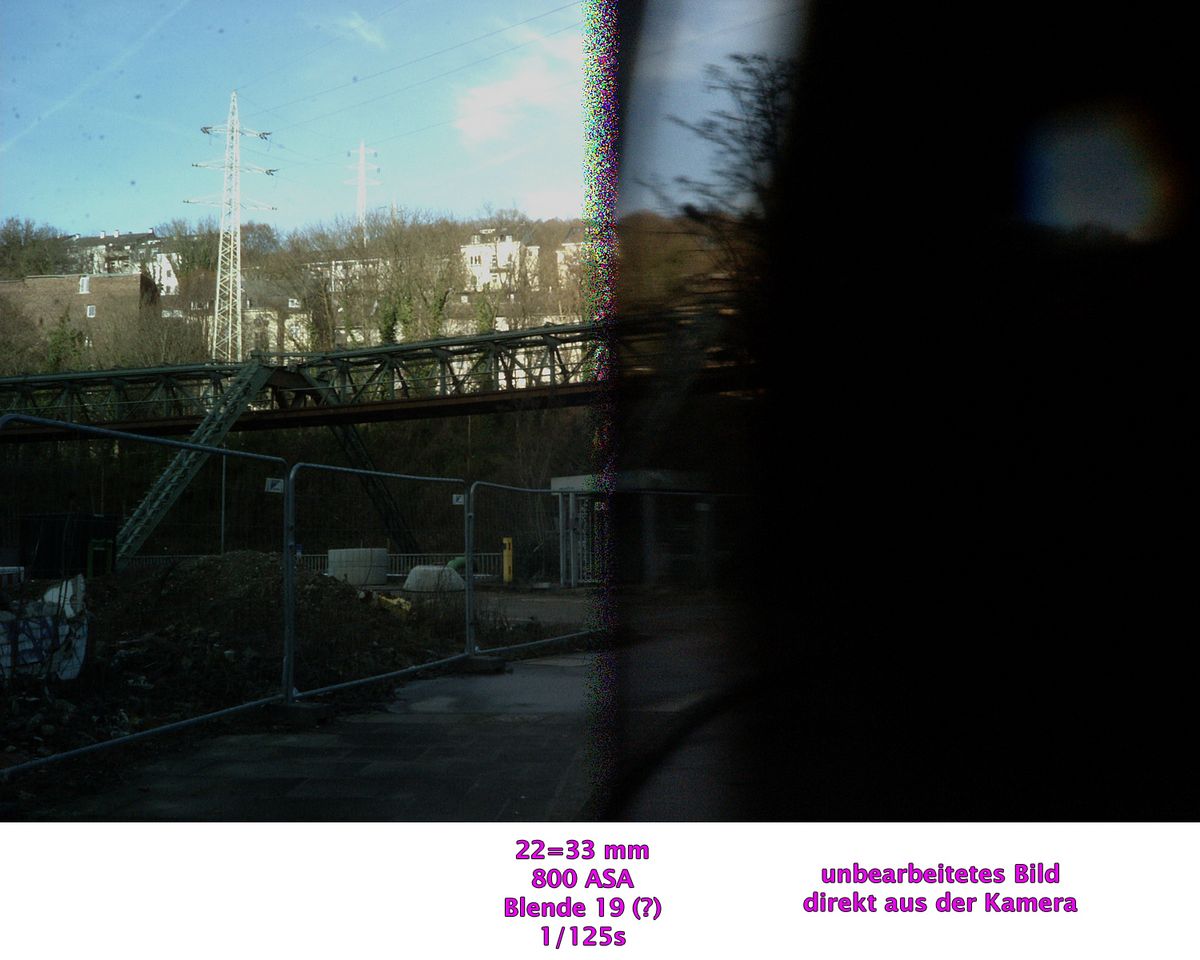 Die Übergangsstelle wird durch beide Sensoren erzeugt, darum erscheint sie bei 200 ASA-Aufnahmen mit einem sanftem Verlauf von Hell nach Dunkel, bei 800 ASA-Bildern wirkt sich das Sensorrauschen stärker aus, der Übergangsbereich ist mit bunten Pixeln durchsetzt, die von links nach rechts immer dunklere Farben haben. Die Stärke des Fehlerbildes ist bei meiner Kamera nicht bei jeder Aufnahme gleich, es scheint von der Objektivbrennweite abhängig zu sein, wie deutlich der Defekt hervortritt.