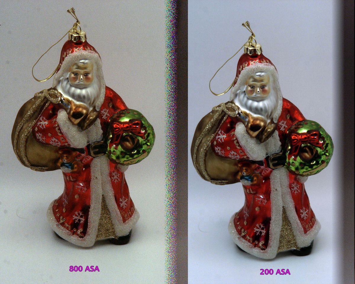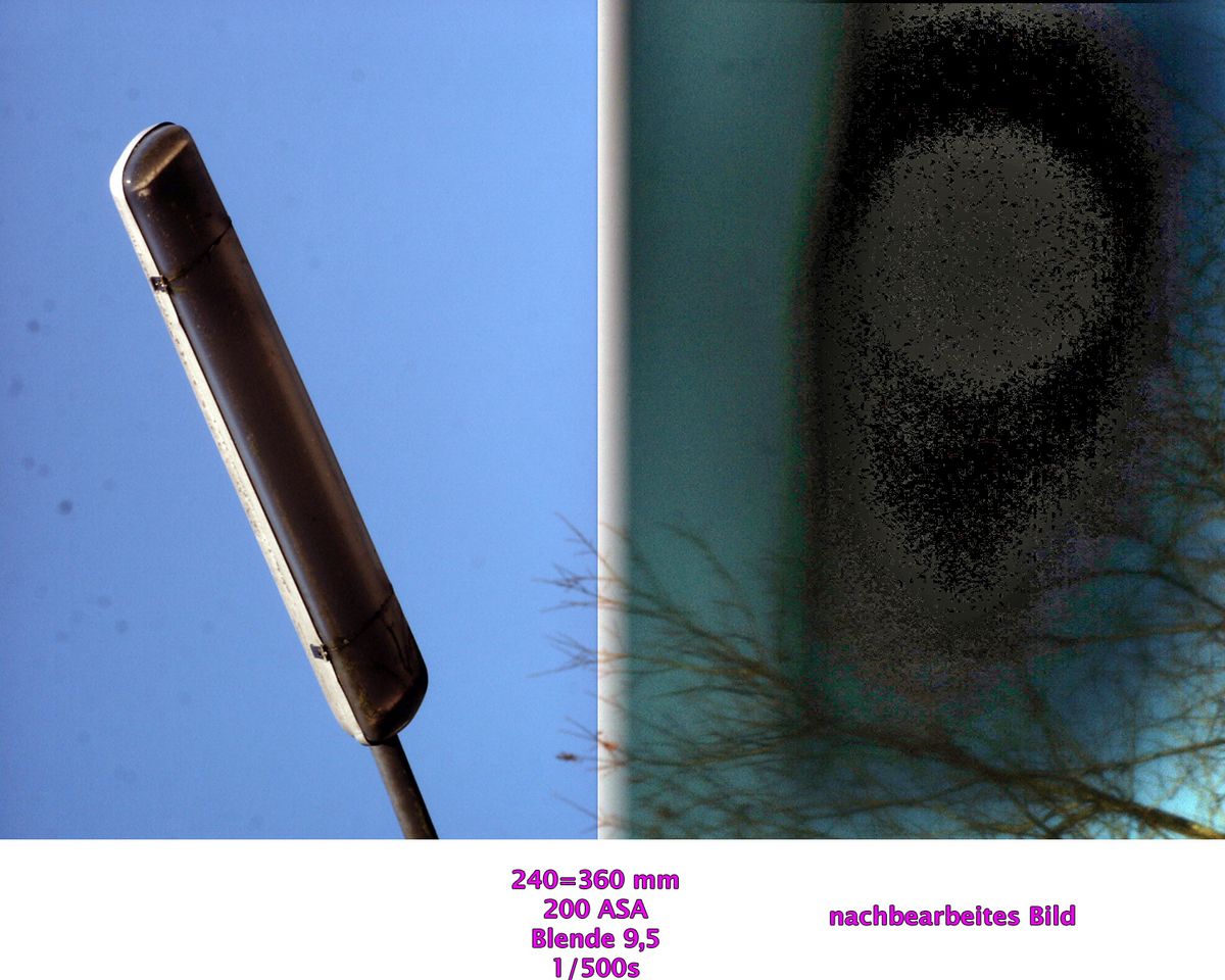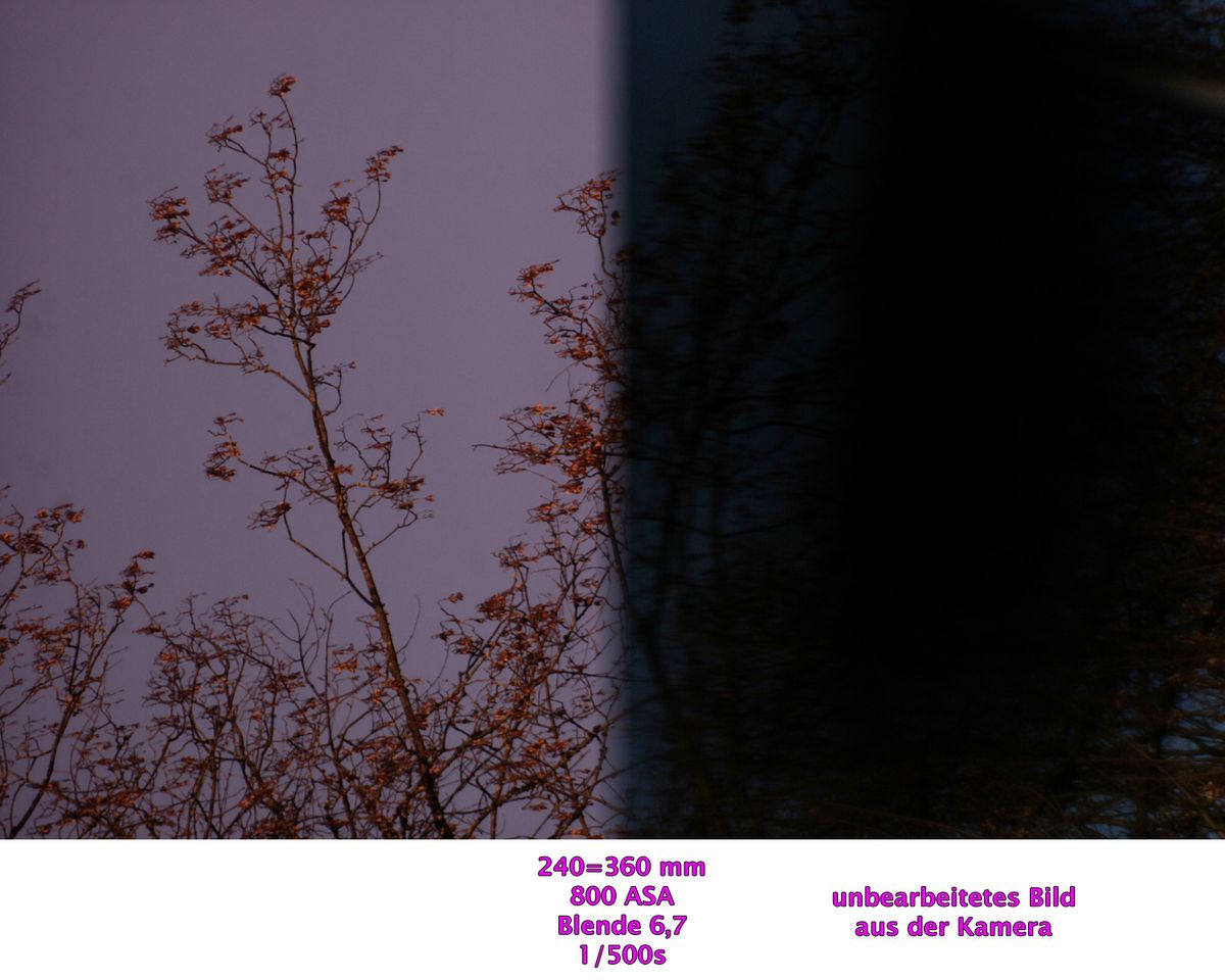 Letztlich resultiert die Relaisoptik in einer verringerten Blendenzahl der Objektive, eine größere Öffnung als 1:6,7 ist nicht möglich, selbst das recht lichtstarke 3,5 / 50 mm - Makro mutiert zu einem Objektiv mit Offenblende 1:6,7. Um das etwas auszugleichen, haben beide Sensoren 200 ASA Grundempfindlichkeit und die erhöhte Empfindlichkeit beträgt 800 ASA (mit starkem Bildrauschen).