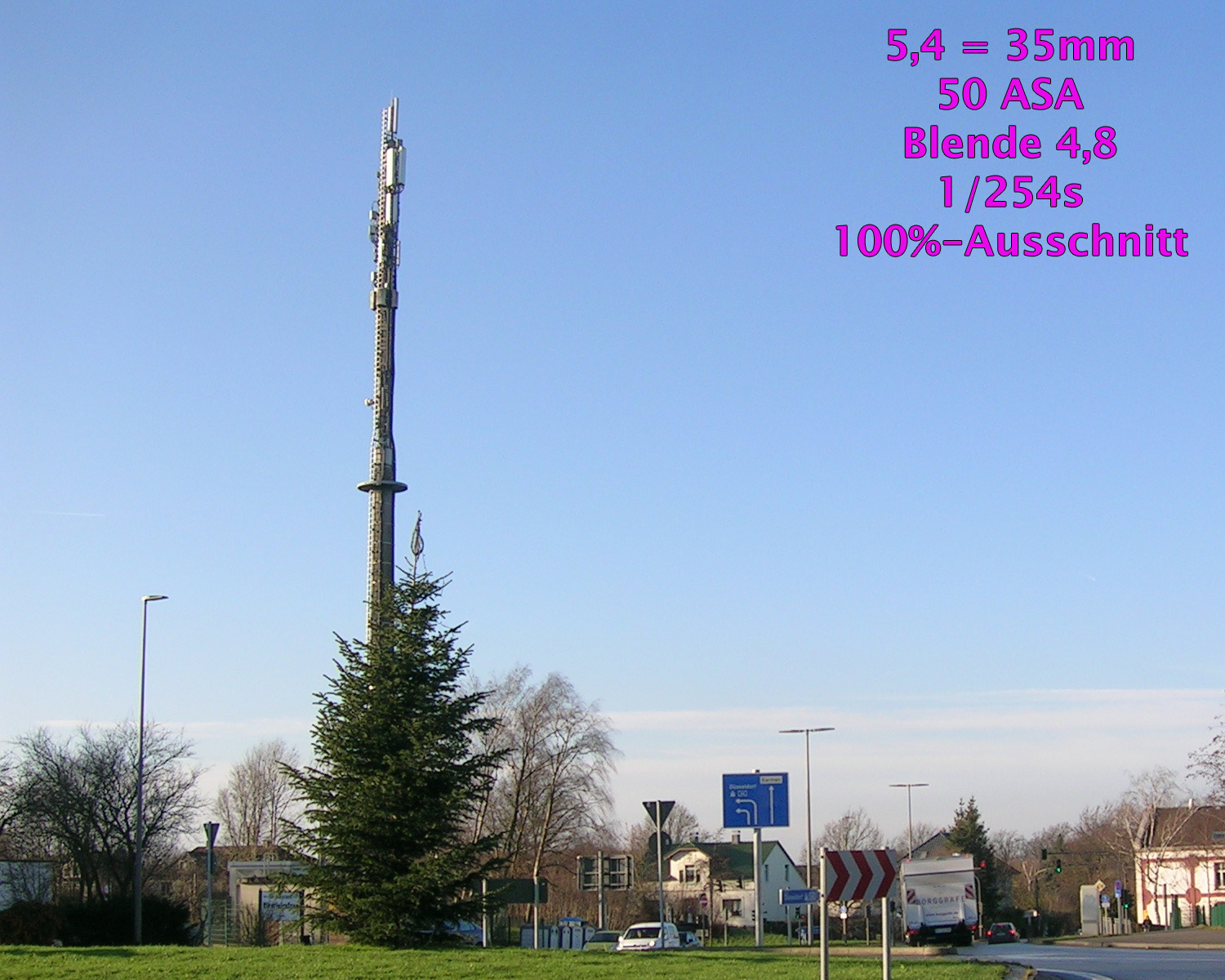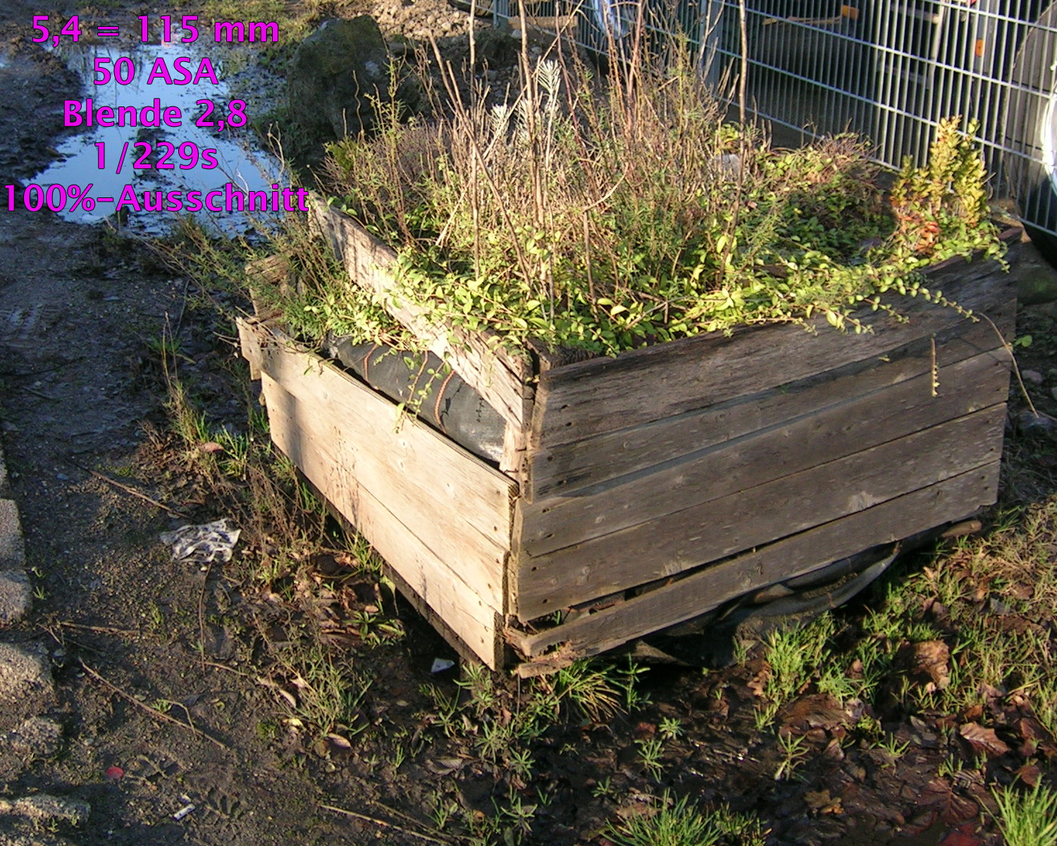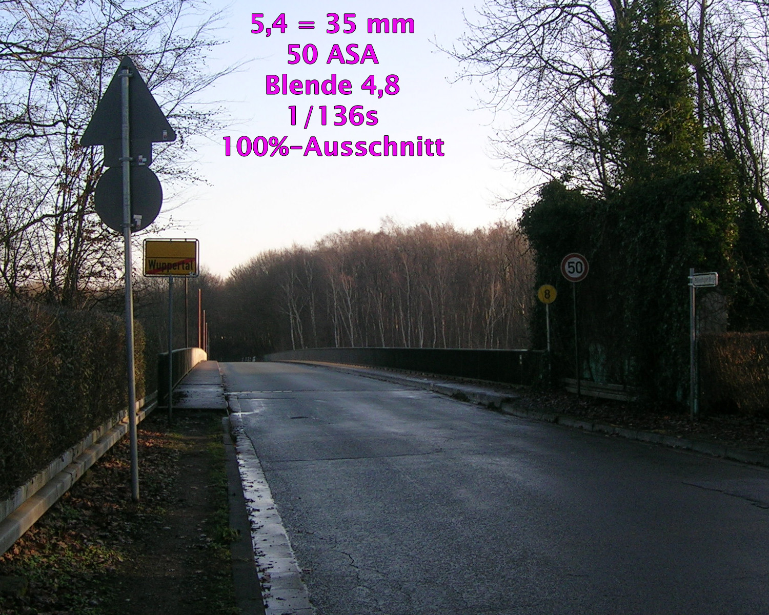 Alle Aufnahmen entstanden bei 50 ASA, gespeichert als JPEG, bearbeitet mit Photoshop CS4. Die Größe wurde auf 1500 Pixel bikubisch verkleinert. Schärfe, Verzeichnung, Vignettierung, Gradationskurve usw. wurde nicht bearbeitet, es sind also fast unveränderte Bilder „Out of the Cam“. Alle Beispiele sind 100%-Ausschnitte, die Aufnahmeparameter sind ins Bild „eingetextet“.