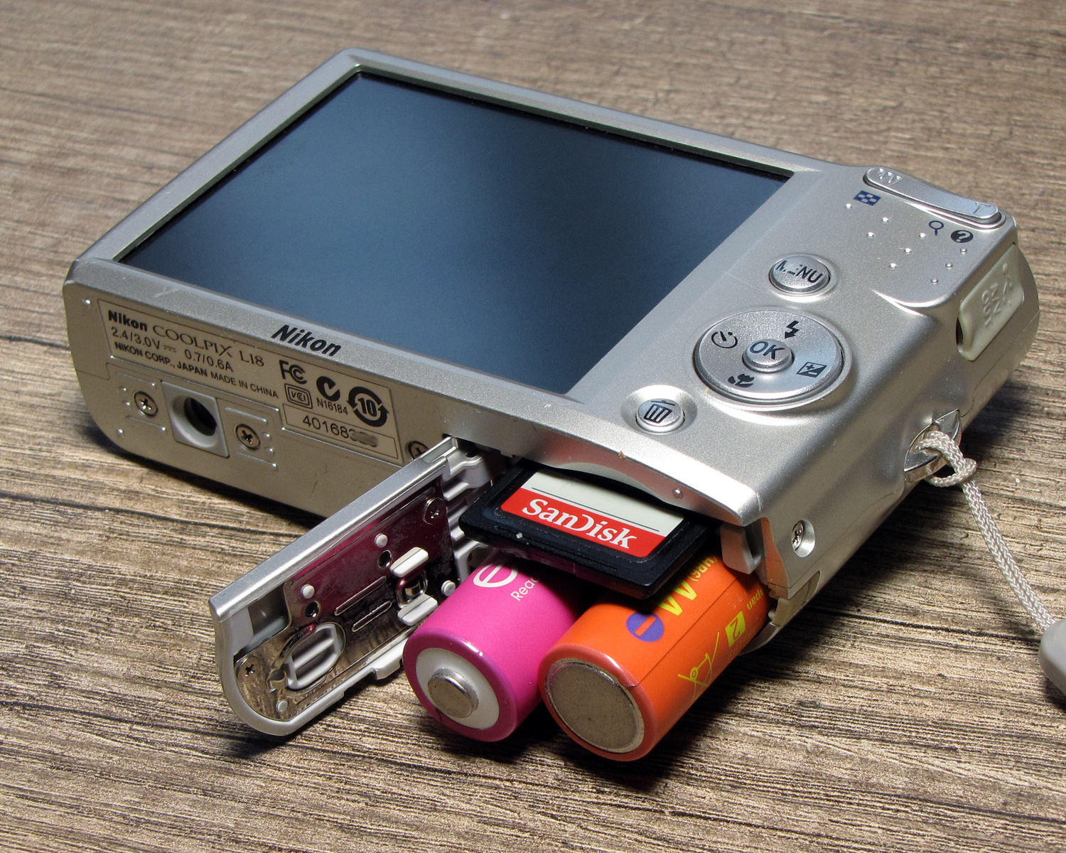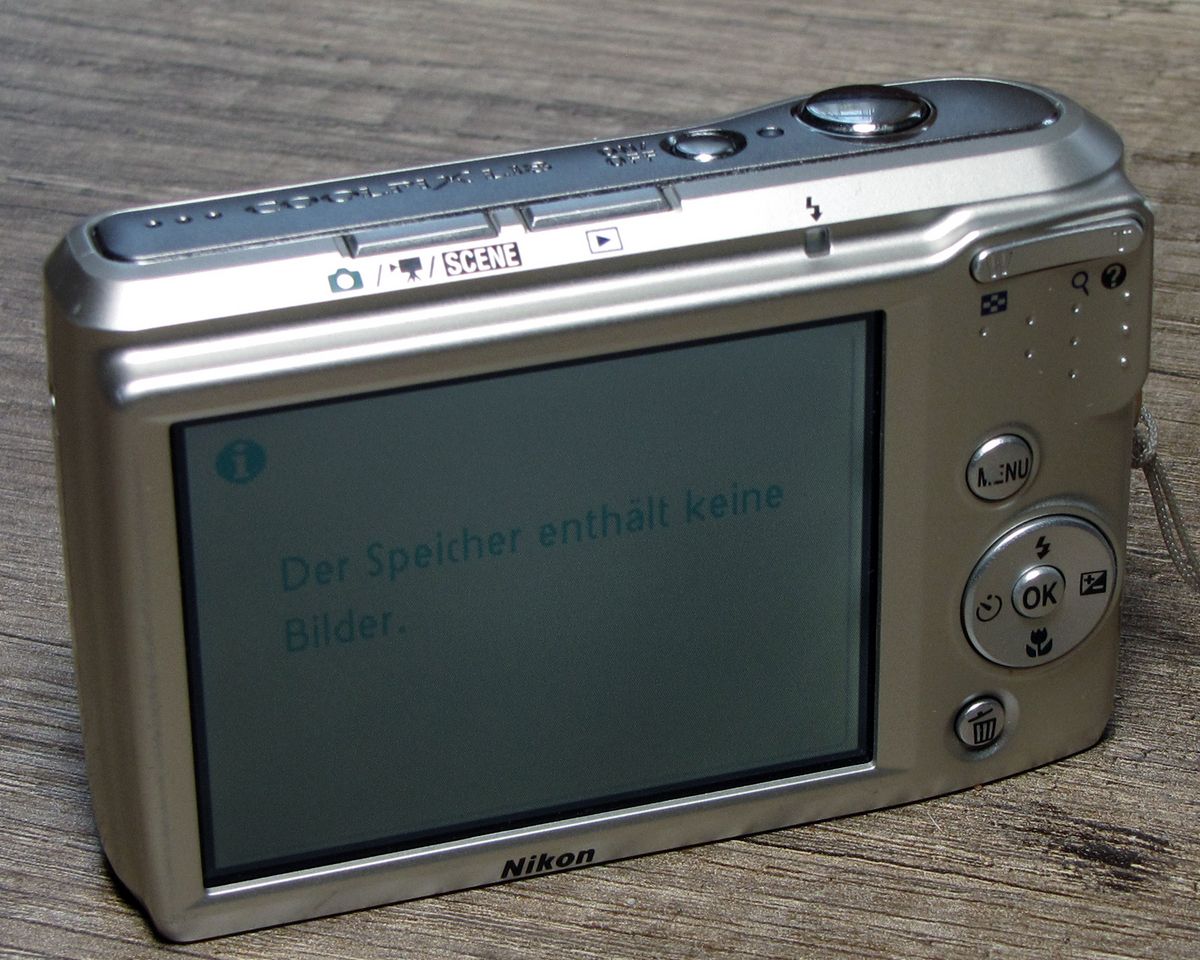 Die Coolpix L18 kann neben den normalen SD-Karten bis 2 GB auch SDHC-Karten bis etwa 32 GB nutzen. Die Kamera ist relativ wählerisch, was große Speicherkarten betrifft, viele meiner 32-GB-Karten hat sie nicht akzeptiert, und einige meiner 16-GB-Karten wurden auch mit der Meldung „Karte kann nicht verwendet werden“ auf dem Display abgewiesen. Und selbst wenn die 16 GB-Karte „läuft“, wird sie nicht perfekt genutzt, die Bildwiedergabe der aufgenommenen Fotos erscheint nur kurz, dann erscheint oftmals eine Meldung „Bild kann nicht angezeigt werden“.