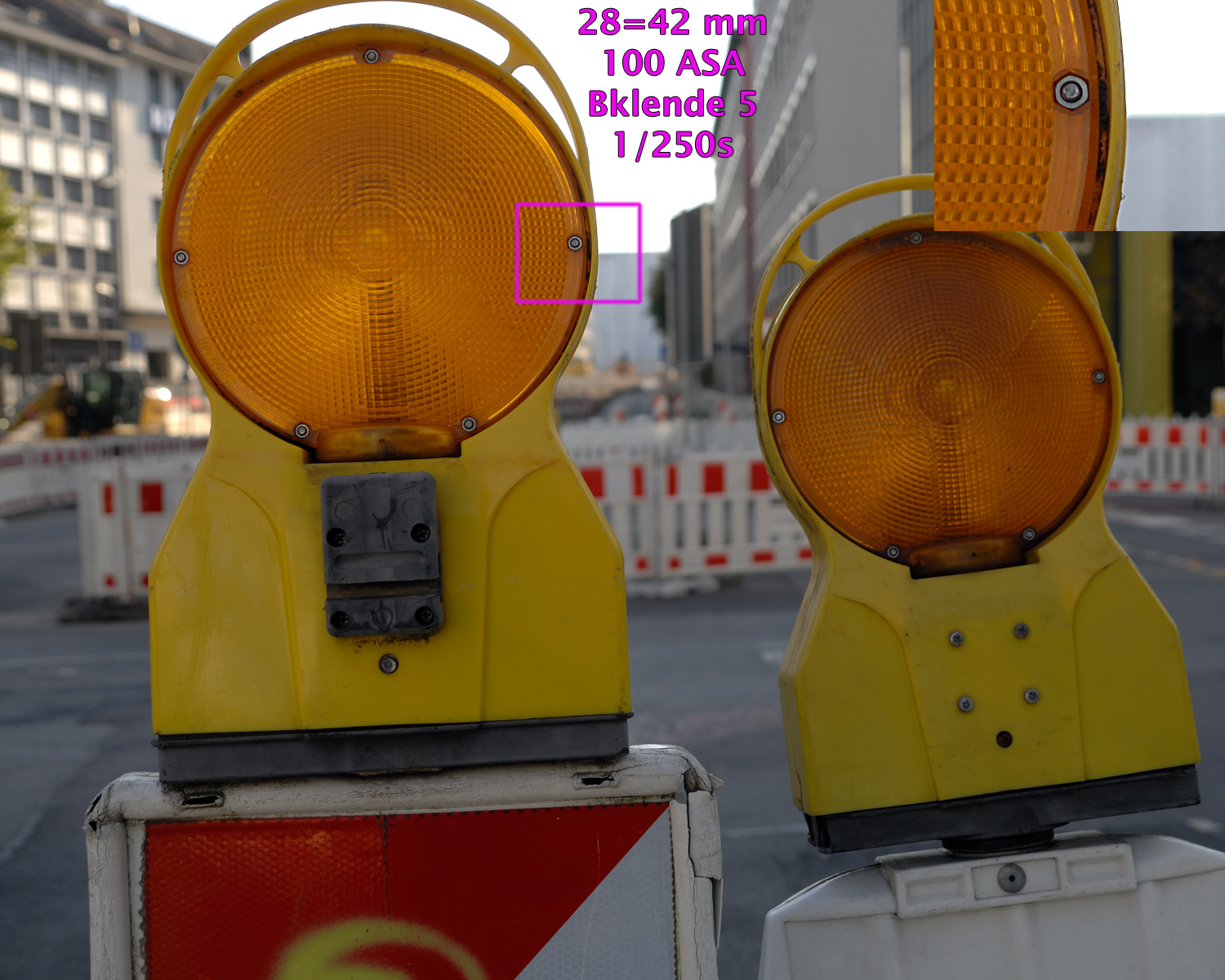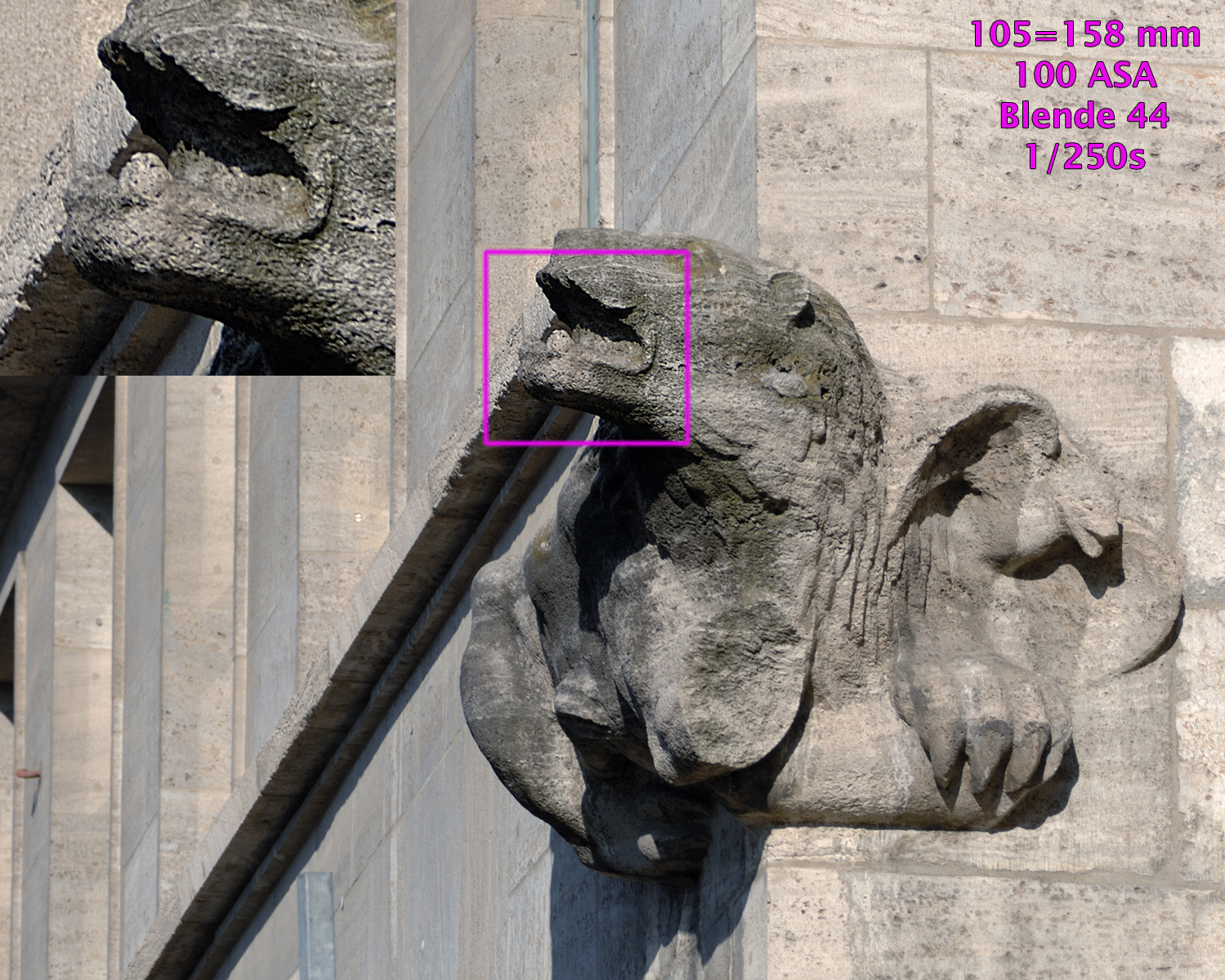Das Objektiv liefert erwartungsgemäß ab Blende 5,6-8 eine sehr gute Schärfe, es kann dann den 12-Megapixel-Sensor der Nikon D2Xs fast ausreizen. Bei Offenblende sind insbesondere die Bildränder etwas unscharf. Chromatische Aberrationen treten nur gering auf. Die Verzeichnung ist gering, denn das Nikkor wurde für Film gerechnet und dort ließen sich die Tonnenförmigen „Verbeulungen“ nicht korrigieren. An der D2Xs sind insbesondere bei großen Brennweiten häufiger deutliche Unschärfen aufgetreten, das dürfte am Spiel der „Schraubenziehermechanik“ liegen, die sich nach dem Fokussieren durch den Spiegelschlag etwas verstellen kann, bei 105mm und Offenblende waren einige Bilder nicht perfekt.