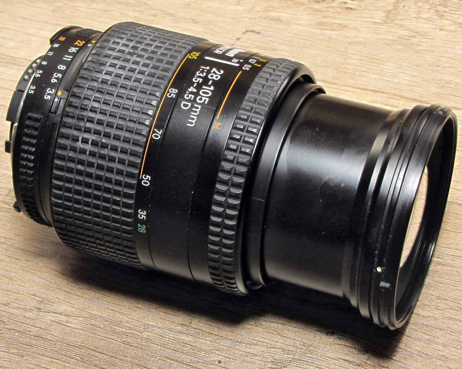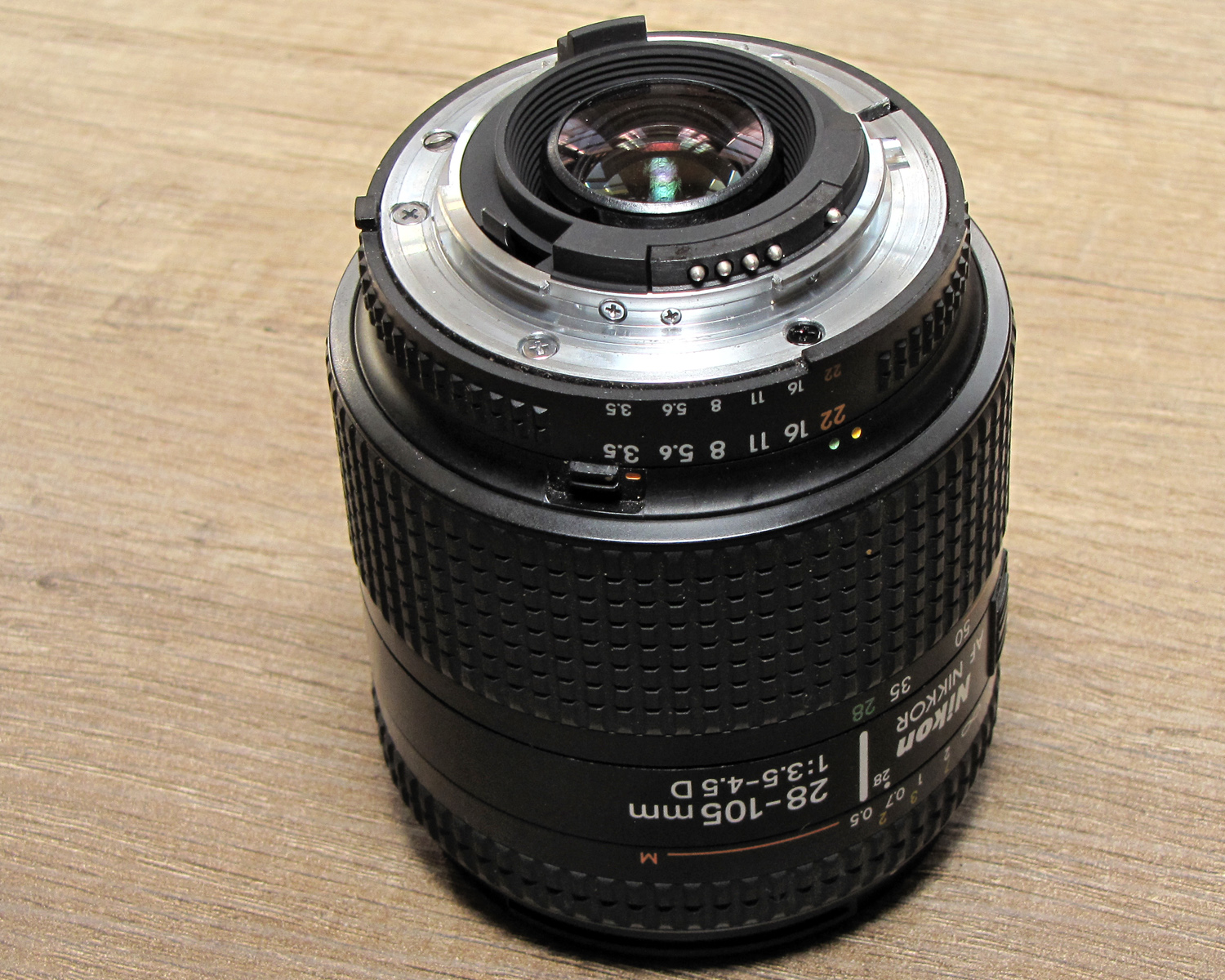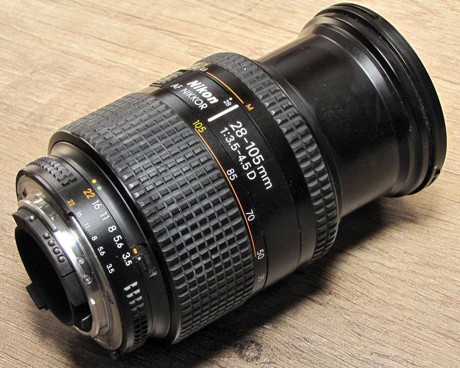 Leider fing mein erstes Exemplar um 2018 herum an zu schwächeln, ich habe es zuvor viele Jahre lang intensiv verwendet, so daß einige der im Inneren befindlichen Führungen für die beweglichen Linsengruppen „ausgeleiert“ sind, darum wackeln die äußeren Tuben deutlich fühlbar, was sich als Dezentrierung und somit deutlicher Unschärfe bei Offenblende und insbesondere im Weitwinkelbereich störend bemerkbar macht. Nach einer Wanderung mit der F90 und dem 28-105 dachte ich, daß die Kamera nicht mehr scharfstellen kann, aber es lag am Objektiv und nicht der F90, denn ein Test mit allen Brennweiten und allen Blenden an der Nikon D800 (Vollformat mit 36 Megapixeln) ergab die Schwächen bei Offenblende, für brauchbare Ergebnisse mußte auf 11-16 abgeblendet werden, was jedoch durch die Beugung zu allgemeinem Schärfenverlust führt.
