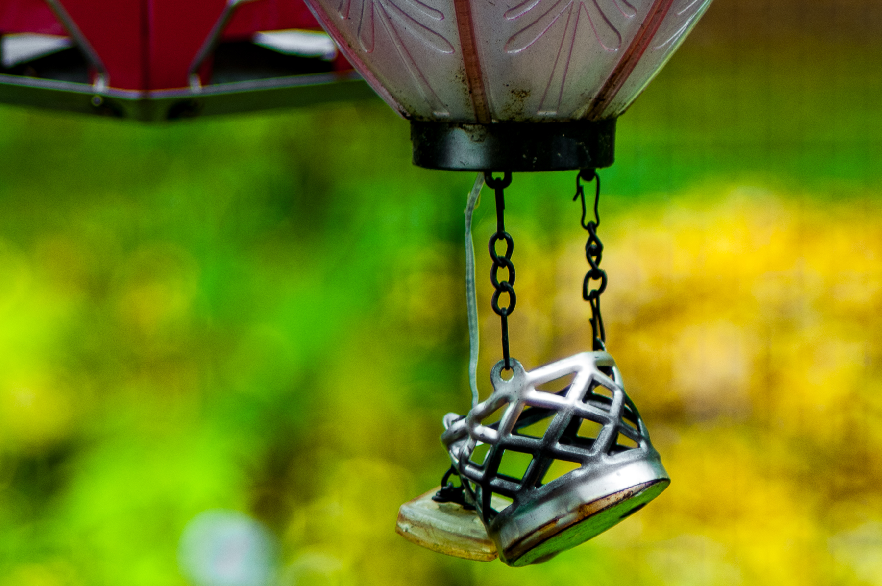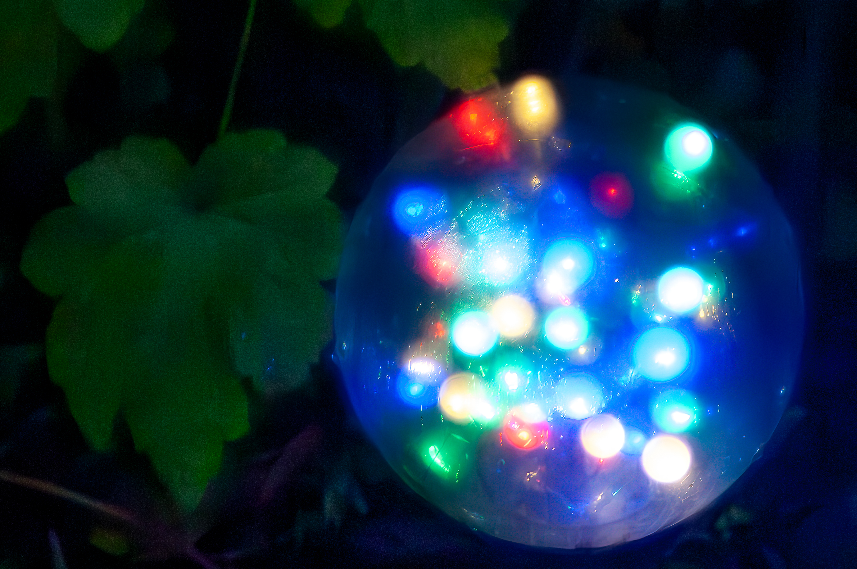 Nachts aus der Hand! Unsere Kirmes-Leuchtkugel im stockdunklen Garten mit ISO 3.200, Offenblende f/1,2, 1/20 s