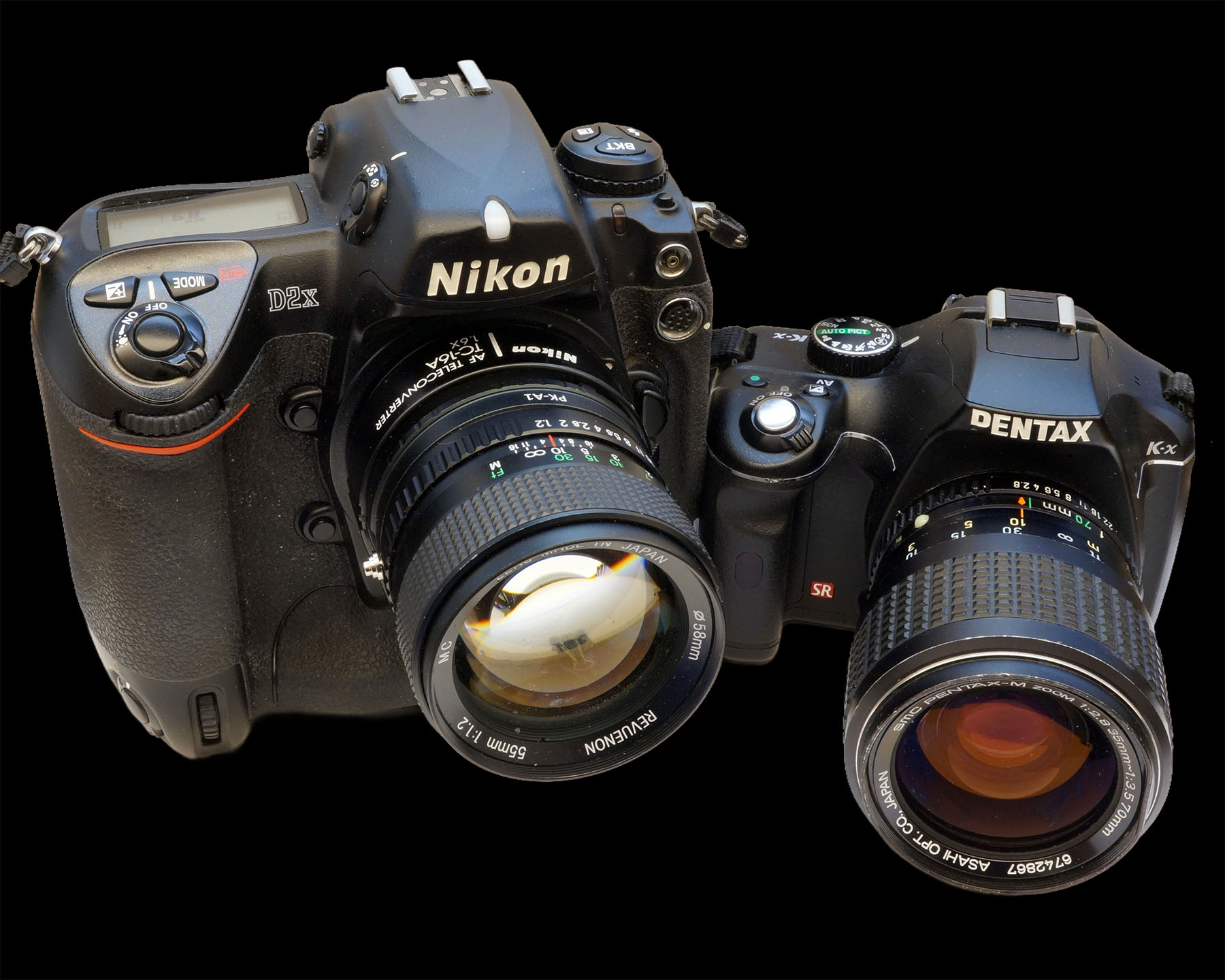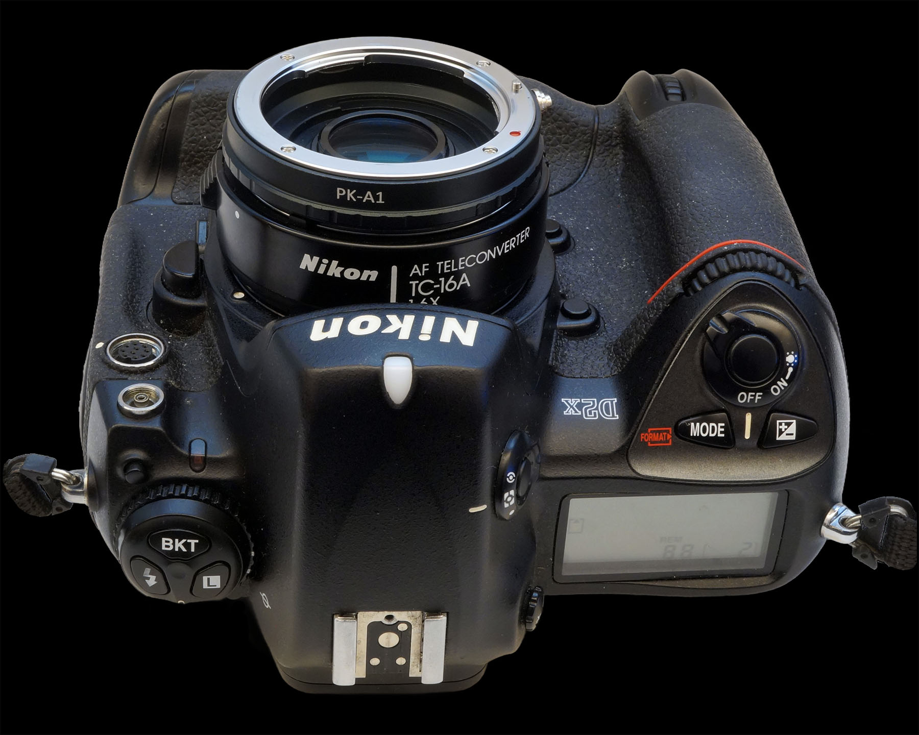 Die oben gezeigte Pentax K-x mit dem REVUENON 55mm 1:1.2 wurde mit dem TAMRON 1:2.5 135mm ADAPTALL-2 auf der Nikon D2X, dem TC-16A und dem Pentax K-auf-Nikon F-Adapter mit Linse abgelichtet!