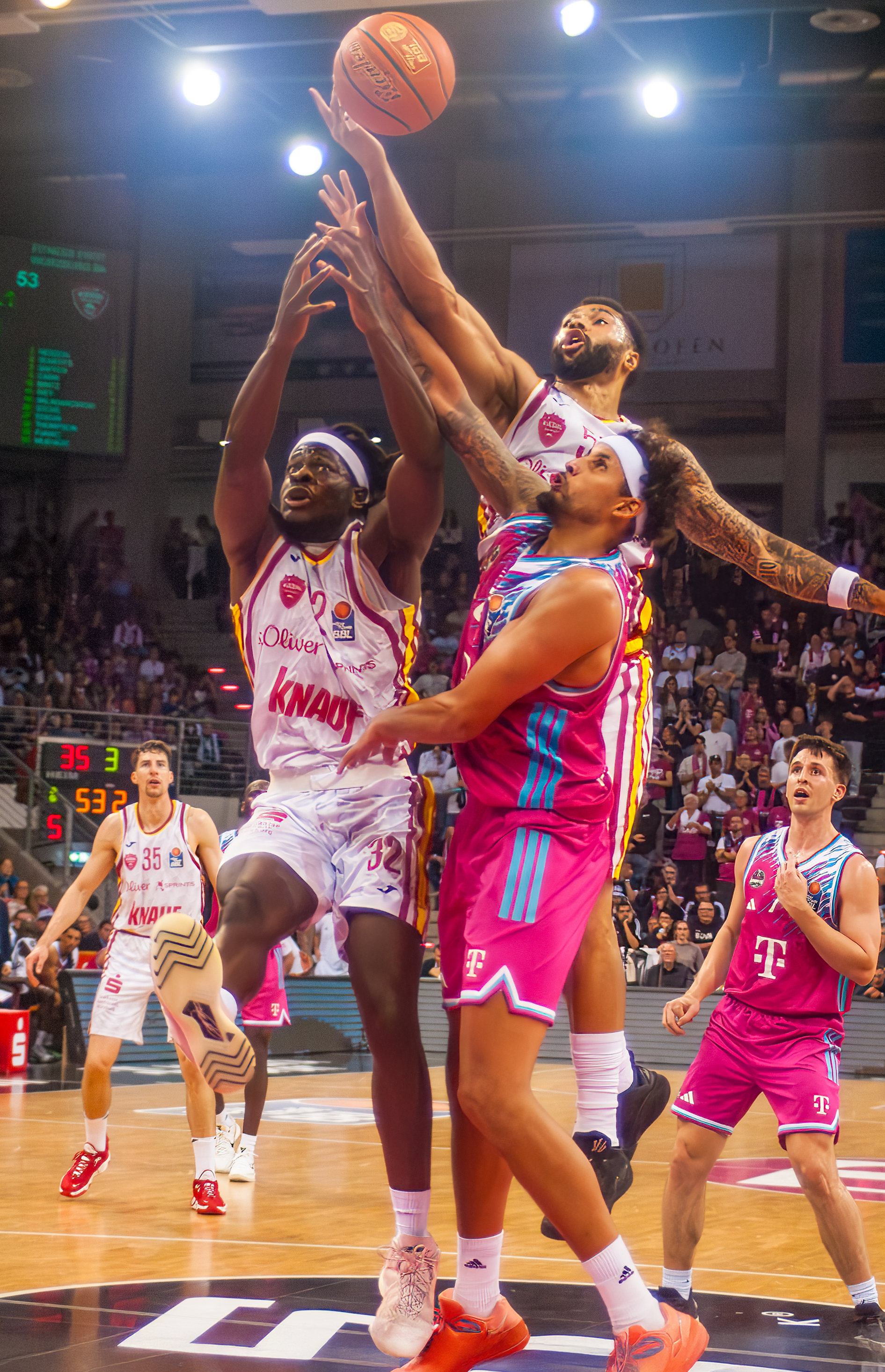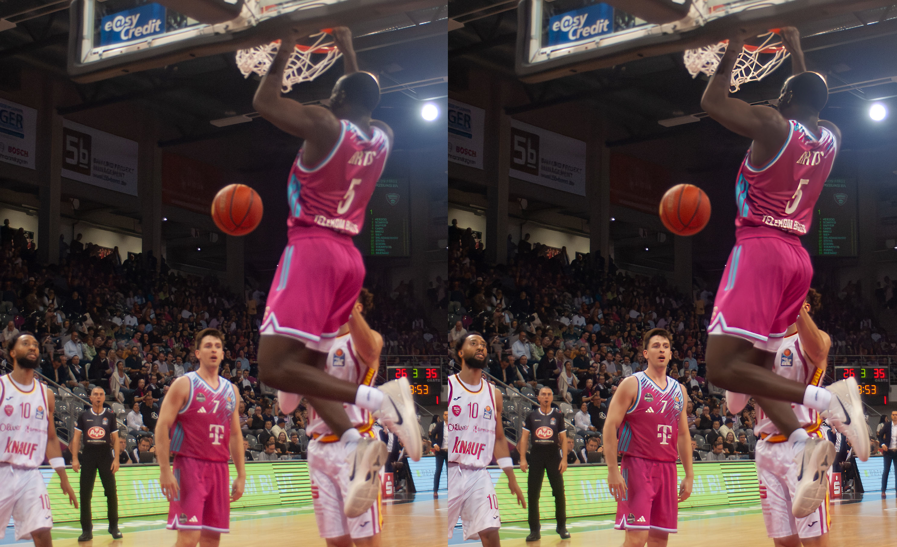 Brav! Stand der Technik 2004/1992. Bewusst habe ich den verunglückten Dunking mit gezeigt. Ich bin mir 100 Prozent sicher, dass der AF auf dem Spieler lag. Und doch: unscharf. Oder nochmal Stand der Technik: Nikon Autofokus von 2004, Objektiv von 1992, zu langsamer (Stangen- )AF. Was ich sehen, zeigen wollte, hat ja funktioniert. Es war möglich mit der Einsteiger DSLR von Nikon auch Sport zu fotografieren. Mein Haupteingriff bestand im Entrauschen der ISO 1.600 mit dem KI-Tool aus Lightroom. Was mir noch aufgefallen war. Die ISO 1.600 waren sehr optimistisch. Ich habe Richtung plus 0.5 bis 0,8 EV aufgehellt. Die ISO 1.600 waren eher ISO 1.000. Und auch ohne Topaz Photo AI etwas stärker geschärft, als üblich. Was auch mit Photoshop-Versionen von 2004 möglich gewesen wäre.