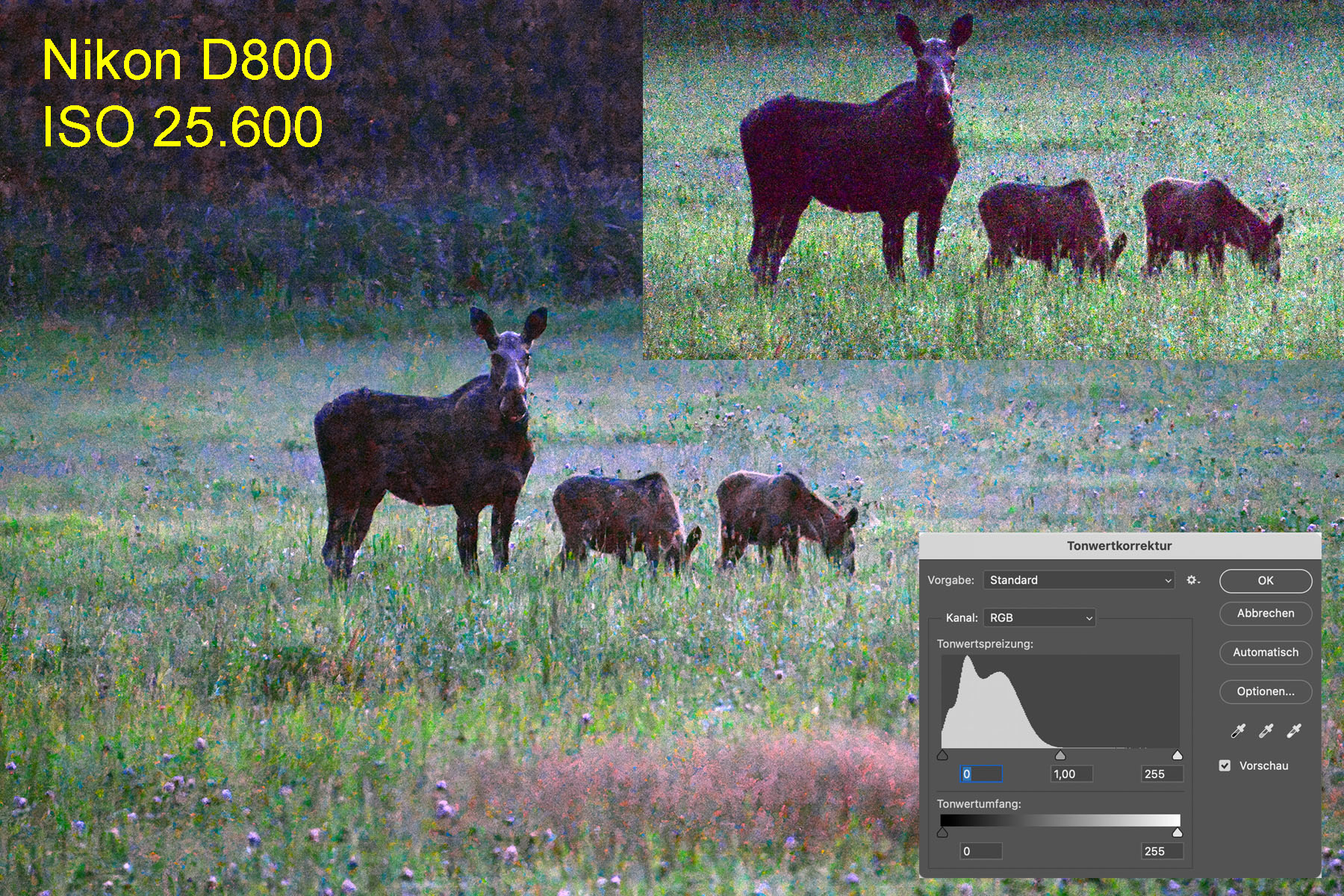 Der Sensor der D800 ist ISO-invariant, d. h., daß das Sensor-Rauschen auch schaltungstechnische Tricks nicht wie bei den Mitbewerbern quadratisch, sondern lediglich linear ansteigt, darum ist die Kamera trotz der hohen Auflösung bis 3200 ASA völlig problemlos nutzbar, erst darüber steigt das Rauschen sichtbar an und der Kontrastumfang sinkt deutlich ab. Deshalb ist die D800 bislang meine einzige Kamera, bei der die ISO-Automatik nicht nur bis maximal 1600, sondern bis 3200 ASA eingestellt ist.