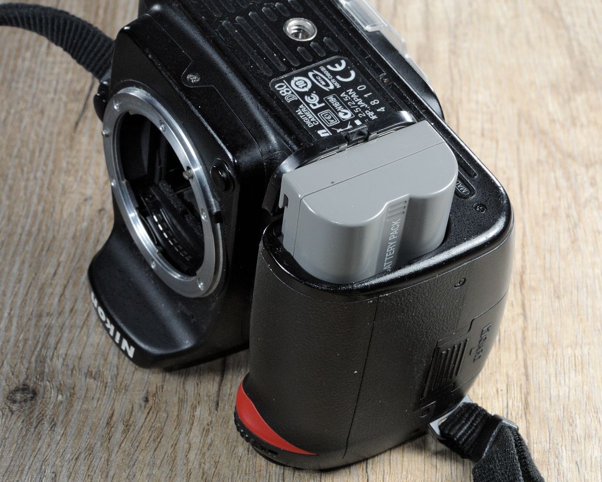 - Unter die Kamera kann ein Batteriegriff mit Hochformatauslöser MB-D80 geschraubt werden. In Ihm können entweder zwei Akkus oder sechs Mignon-Zellen Platz finden. Außerdem hat er ein weiteres Daumenrad und eine Taste.
