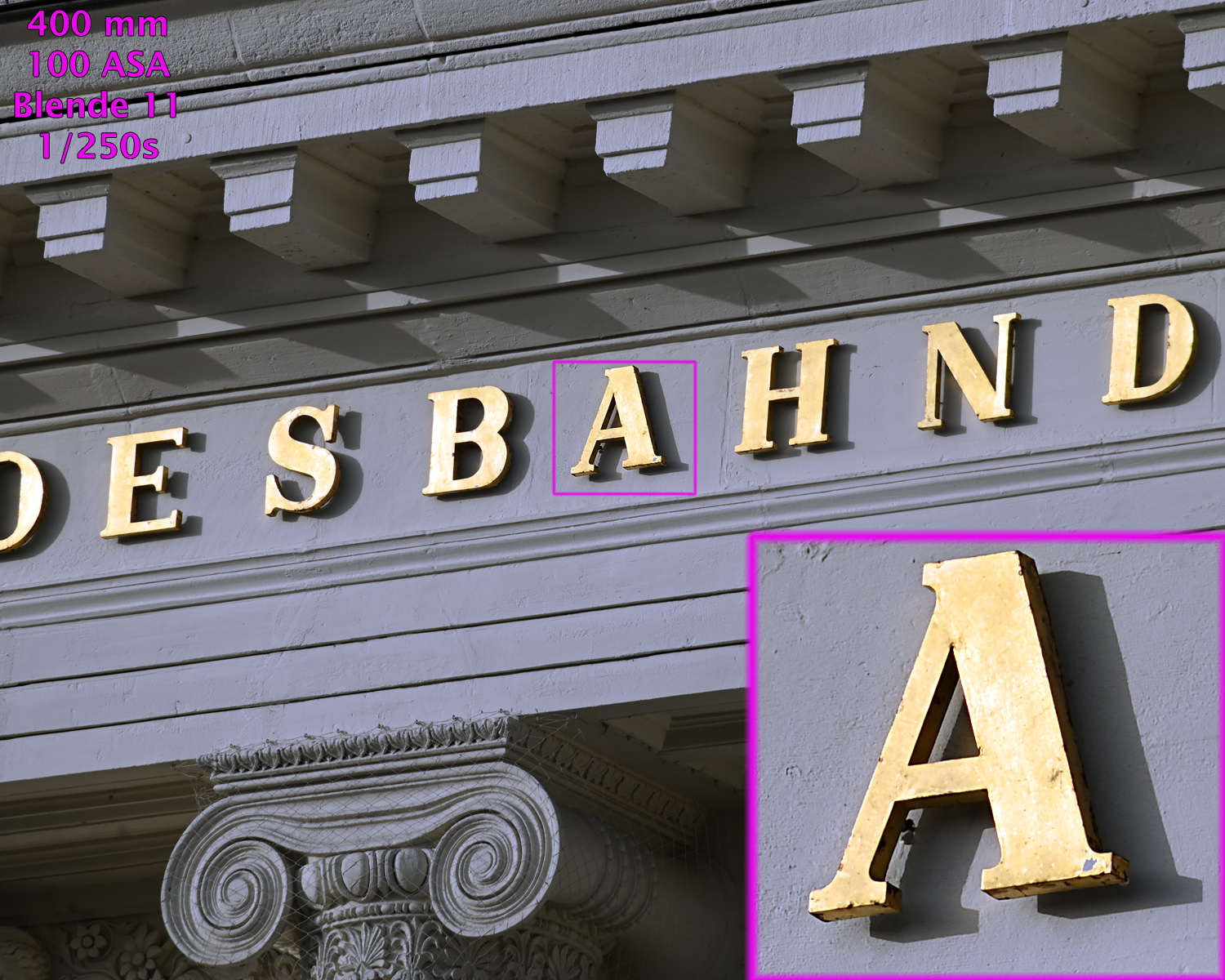 Alle Beispielaufnahmen entstanden freihand bei ASA-Automatik, Zeitautomatik, mit eingeschaltetem Bildstabilisator und bei Blende 11, gespeichert als NEF, gewandelt mit Nikon Capture NX-D und bearbeitet mit Photoshop CS4. Bildausschnitt, Helligkeit, Farben, Lichter / Schatten sowie Schärfe wurden korrigiert, die Größe wurde auf 1500 Pixel bikubisch verkleinert. In alle Aufnahmen sind 100%-Ausschnitte vergrößert einmontiert.