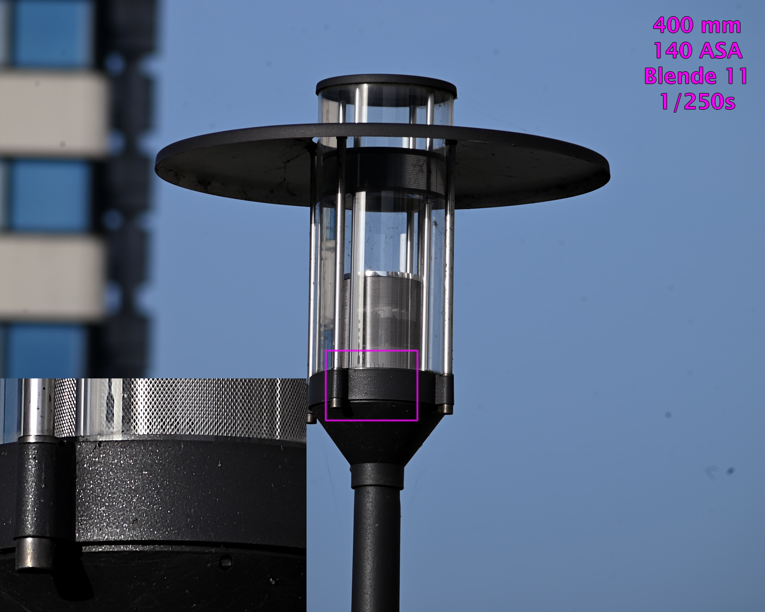 An aktuellen spiegellosen Systemkameras macht sich die Vorwahlblende nicht negativ bemerkbar, man kann bei eingestellter Arbeitsblende 1:11 noch gut scharfstellen. Freihand ist entweder helle Umgebung mit passenden kurzen Belichtungszeiten oder ein guter kamerainterner Bildstabilisator nötig, die Verwendung eines stabilen Stativs ermöglicht auch Aufnahmen bei schlechteren Lichtverhältnissen. 400mm sind schon ziemlich viel Tele, an APS-C-Cropkameras entsprechen sie 600mm, an einer mFT-Kamera wird aus dem Beroflex ein 800mm-Supertele! Und darum werde ich bei Gelegenheit noch ausprobieren, wie das Objektiv an einer Olympus Pen F abschneidet.