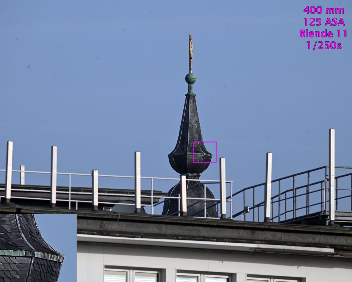 An aktuellen spiegellosen Systemkameras macht sich die Vorwahlblende nicht negativ bemerkbar, man kann bei eingestellter Arbeitsblende 1:11 noch gut scharfstellen. Freihand ist entweder helle Umgebung mit passenden kurzen Belichtungszeiten oder ein guter kamerainterner Bildstabilisator nötig, die Verwendung eines stabilen Stativs ermöglicht auch Aufnahmen bei schlechteren Lichtverhältnissen. 400mm sind schon ziemlich viel Tele, an APS-C-Cropkameras entsprechen sie 600mm, an einer mFT-Kamera wird aus dem Beroflex ein 800mm-Supertele! Und darum werde ich bei Gelegenheit noch ausprobieren, wie das Objektiv an einer Olympus Pen F abschneidet.