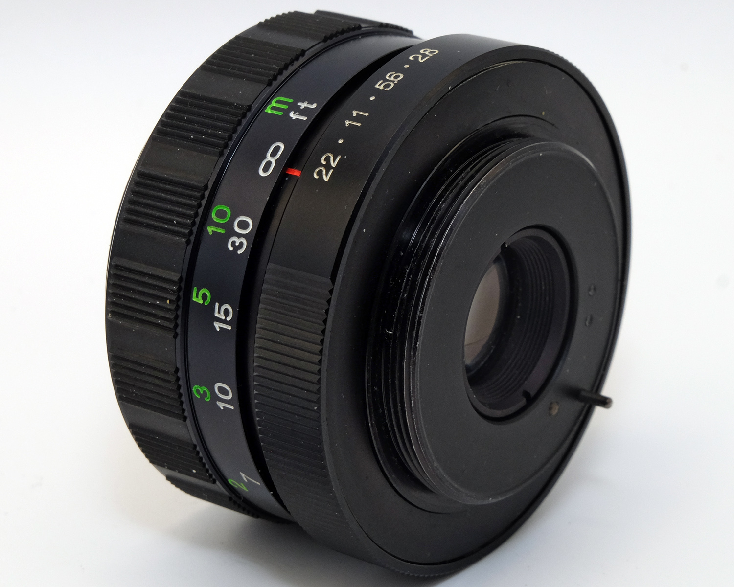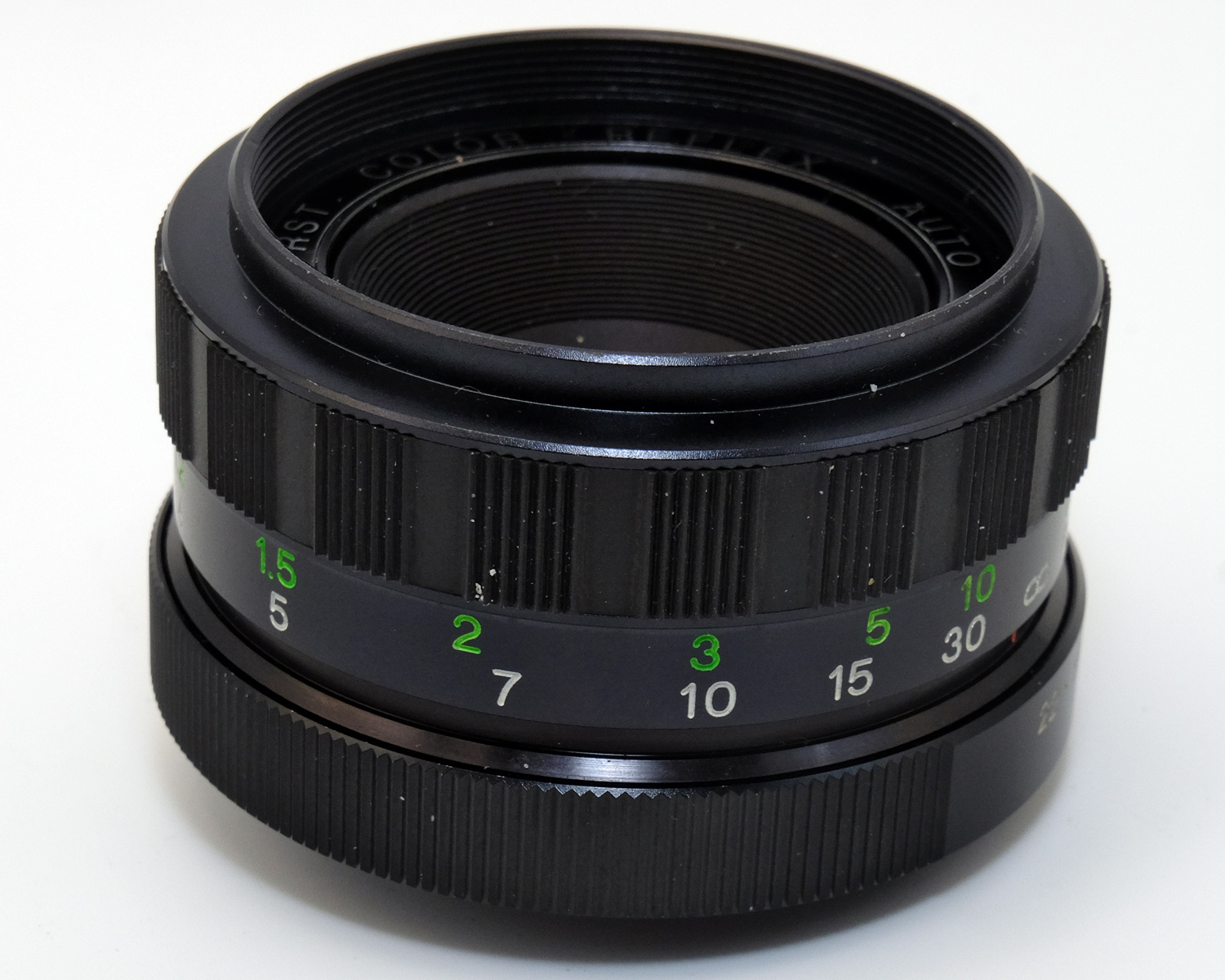 Das gezeigte 2,8/55mm ist ein einfachvergütetes Objektiv, ein Herstell-Land ist nicht angegeben, die Kamera im Set ist mit „Made in Japan“ graviert und stammt ebenfalls von Cosina. Das Objektiv ist ein Tessartyp mit 4 Elementen in 3 Gruppen. Die „krumme“ Brennweite von 55mm ist der Tatsache geschuldet, daß die Hinterlinse nicht mit dem Spiegel der Kamera kollidieren darf, kürzere Brennweiten erfordern zusätzliche optische Elemente für die dann nötige Retrofokus-Bauart, das hätte das Objektiv verteuert.
