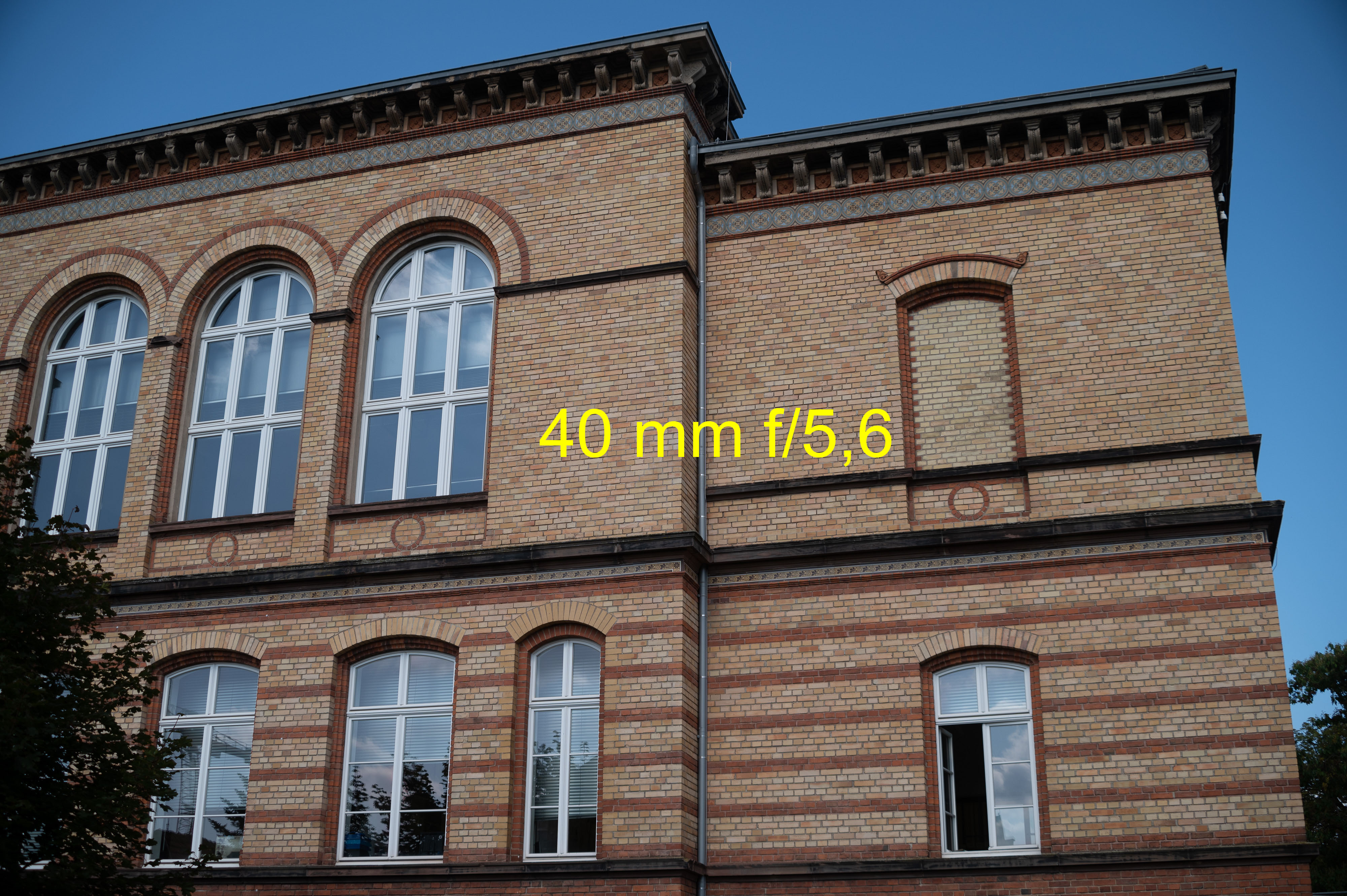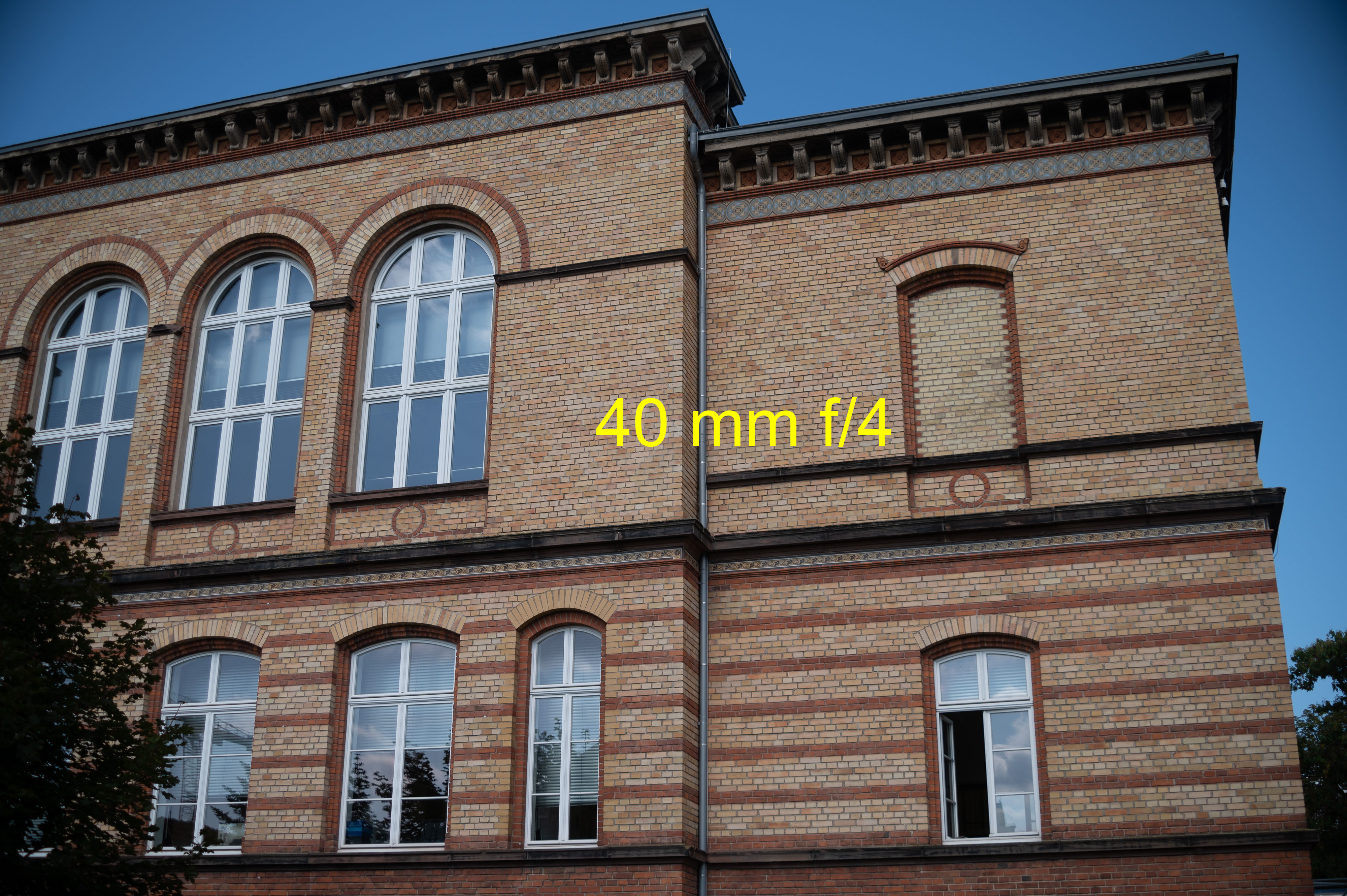 - 40 mm Offenblende f/2,8: deutliche Vignettierung, in den Ecken fehlt etwas Schärfe