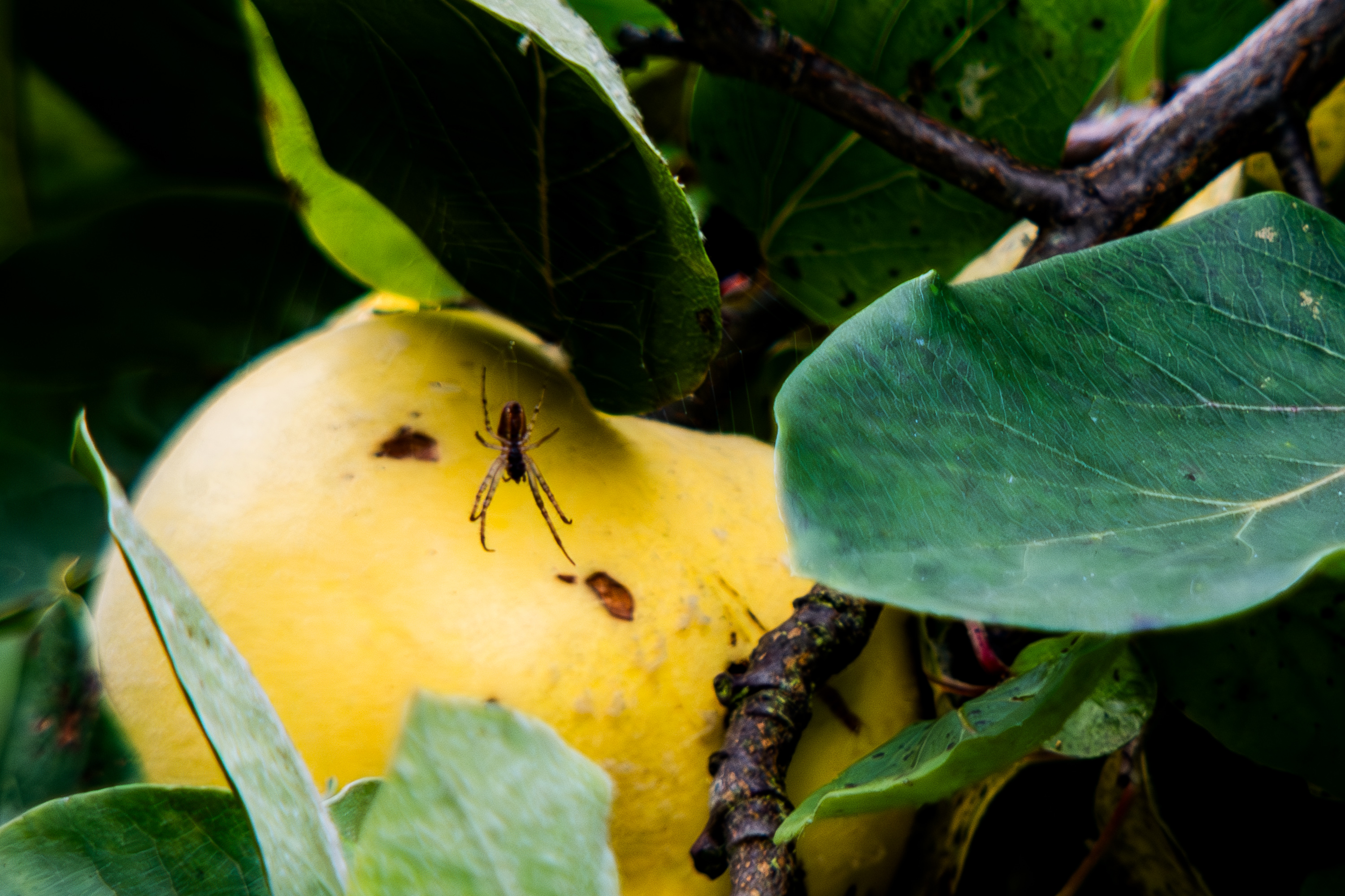 Für die paar Fotos im Nahbereich zwischen 2,5 m und 10-50 m (nicht gemessen!) ist es ein ganz nettes Spielzeug. Im Sommer kalkulierten wir noch mit 2 Quitten. Es sind 10 geworden ;-) Die noch irgendwie verarbeitet werden müssen. Die lauernde Spinne vor der Quitte habe ich natürlich nur durchs Zoom bei 250 mm Brennweite und Minimaldistanz 2,5 m entdeckt. Um die später auf dem Monitor entsprechend zu vergrößern. Bei den Bildchen wurde mit Lightroom kräftig nachgeschärft.