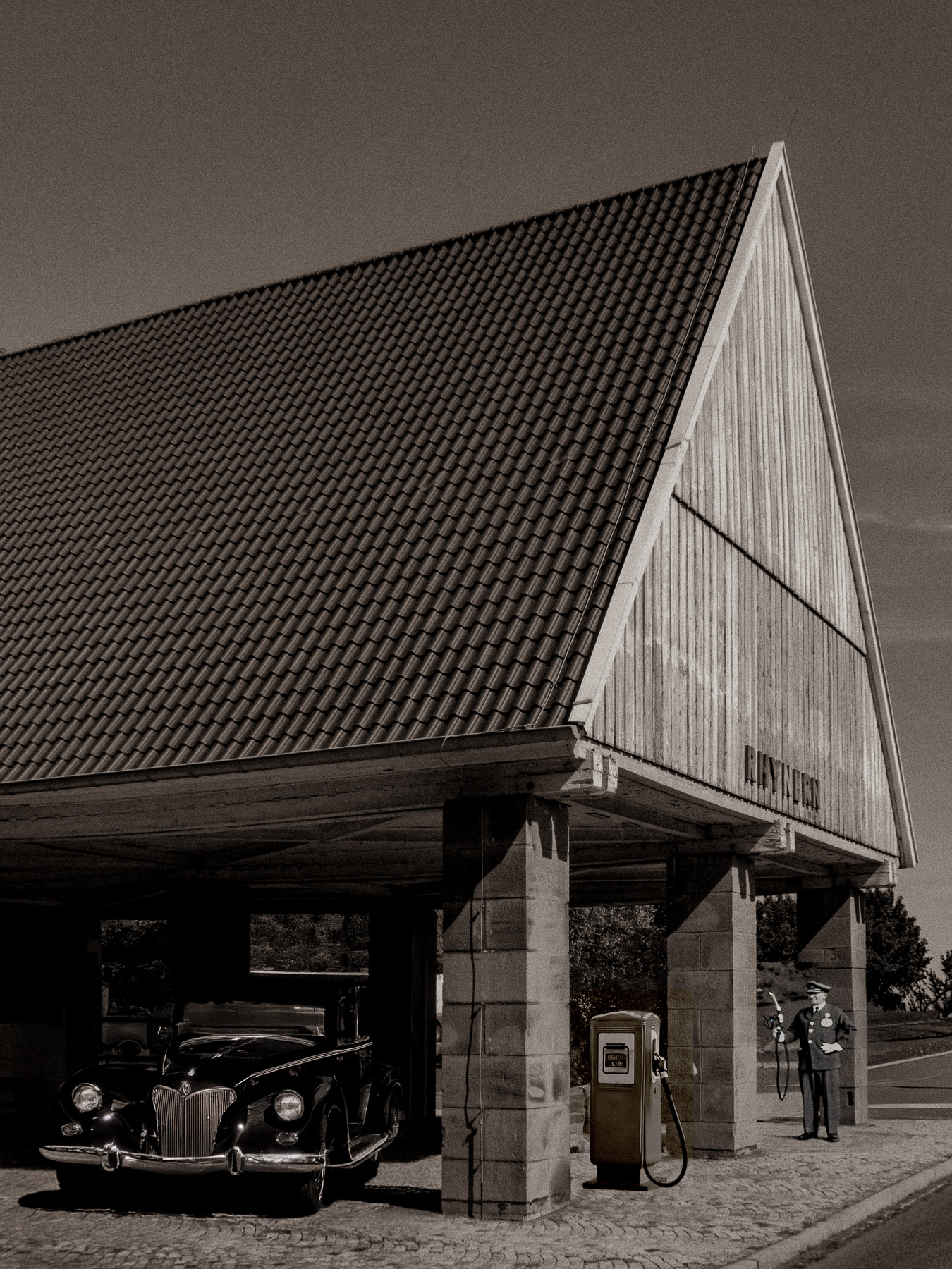 Um das Foto einen Hauch authentischer zu machen, wurde in der Hochformataufnahme alles entfernt, was störte, und die Szenerie in die 1950er Jahre zurückversetzt. Die Photoshop KI generierte das Auto, die Tanksäule und den Tankwart der 1950er Jahre. Dazu das Ganze in SW/Sepia getont und mit etwas Extra-Korn versehen.