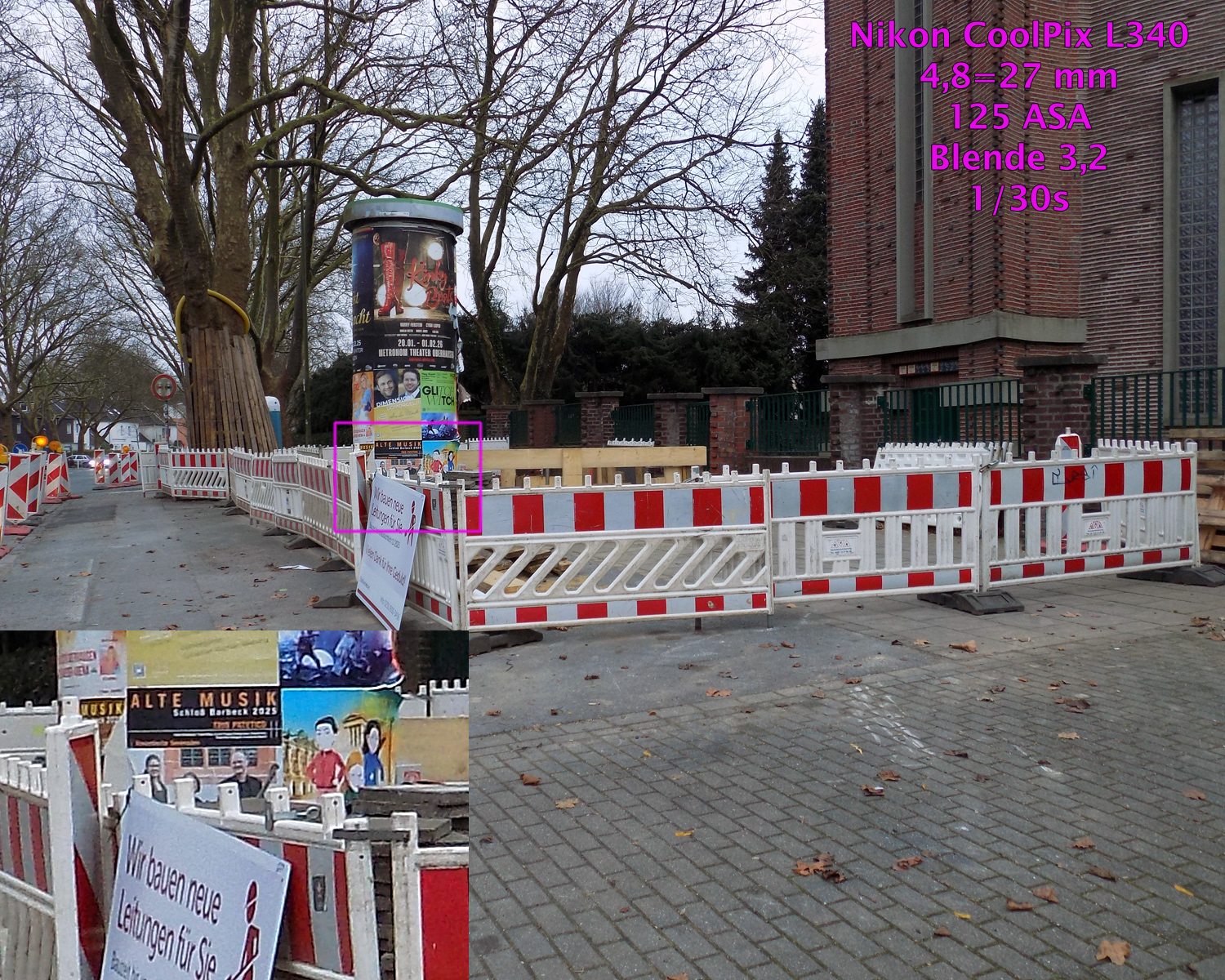 Die beiden Beispielaufnahmen entstanden bei 80 bzw 125 ASA, gespeichert als JPG, bearbeitet mit Photoshop CS4. Bildausschnitt, Helligkeit, Farben, Lichter / Schatten sowie Schärfe wurden korrigiert, die Verzeichnung konnte aufgrund der Motive unkorrigiert bleiben, die Größe wurde auf 1500 Pixel bikubisch verkleinert. In die Aufnahmen sind 100%-Ausschnitte vergrößert einmontiert.