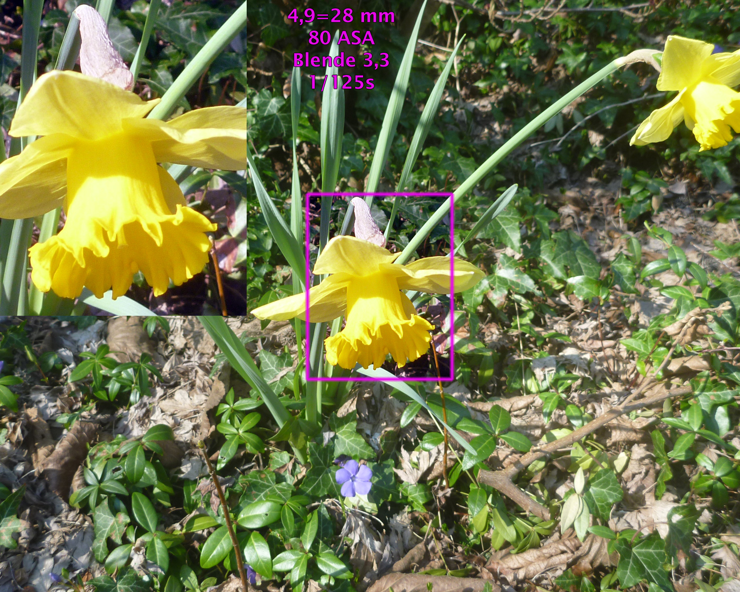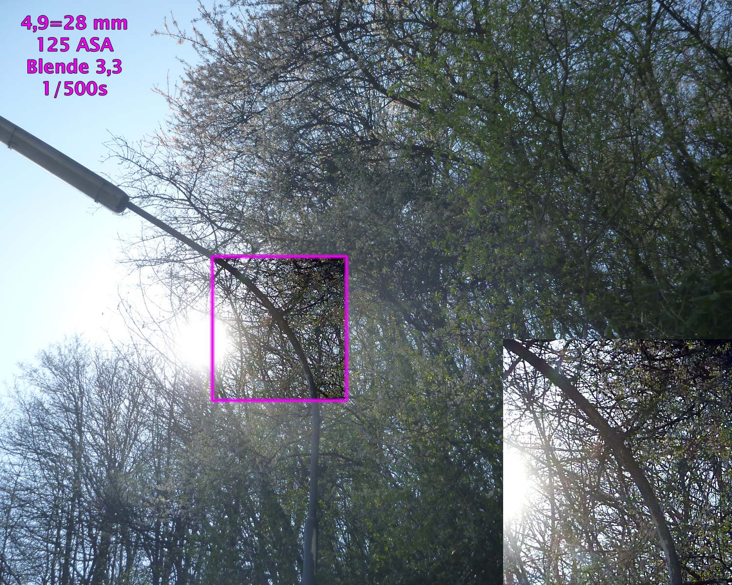 Alle Beispielaufnahmen entstanden bei Vollautomatik, gespeichert als JPEG, bearbeitet mit Photoshop CS4. Die Größe wurde auf 1500 Pixel bikubisch verkleinert. Schärfe, Verzeichnung, Vignettierung, Gradationskurve usw. wurde nicht bearbeitet, es sind also fast unveränderte Bilder „Out of the Cam“. In alle Beispiele sind 100%-Ausschnitte einmontiert. Belichtungszeiten- und Brennweiten-Angaben sind in die Bilder eingefügt.