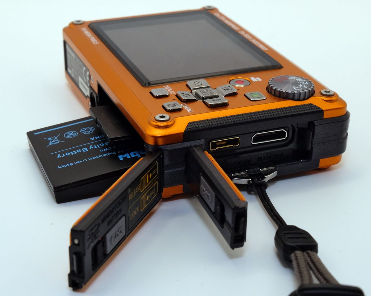 Die Kamera ist aufwendig abgedichtet, alle Bedienteile sind mit Silikonmanschetten verschlossen, die beiden Klappen haben ebenfalls einen O-Ring und zusätzlich eine doppelte Verriegelung, damit sie nicht versehentlich geöffnet werden können. Wie üblich sollten die Klappendichtungen regelmäßig ausgetauscht werden, damit sie funktionieren, denn durch den ständigen Druck werden sie allmählich verformt und dichten dann nicht mehr sicher ab. Leider sind es Spezialbauteile, die nur bei Panasonic zu kaufen waren.