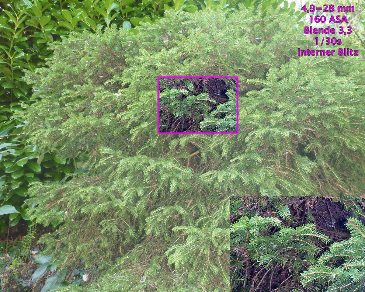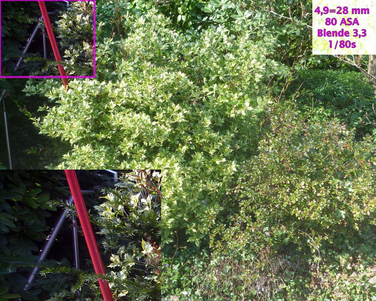 Alle Beispielaufnahmen entstanden bei Vollautomatik, gespeichert als JPEG, bearbeitet mit Photoshop CS4. Die Größe wurde auf 1500 Pixel bikubisch verkleinert. Schärfe, Verzeichnung, Vignettierung, Gradationskurve usw. wurde nicht bearbeitet, es sind also fast unveränderte Bilder „Out of the Cam“. In alle Beispiele sind 100%-Ausschnitte einmontiert. Belichtungszeiten- und Brennweiten-Angaben sind in die Bilder eingefügt.