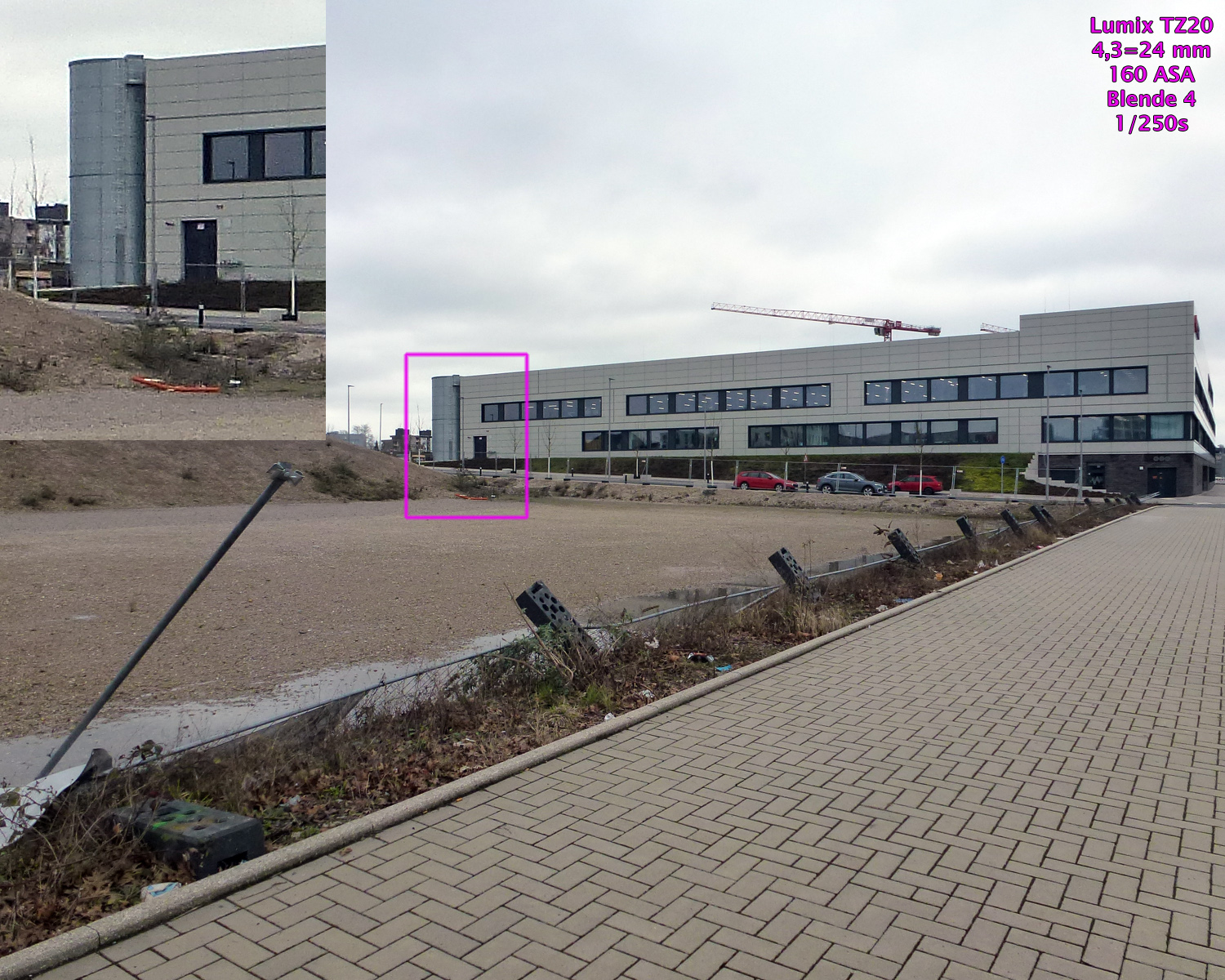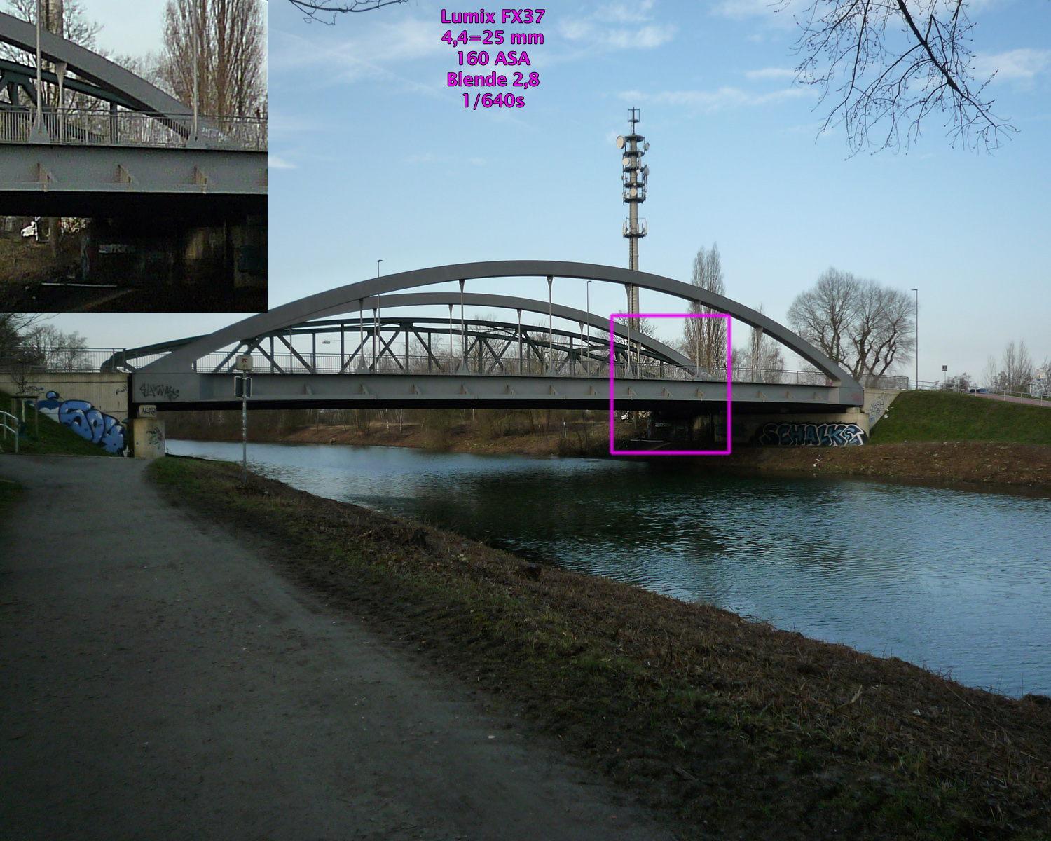 Die beiden Beispielaufnahmenentstanden mit Programm- und Empfindlichkeitsautomatik, gespeichert als JPEG, bearbeitet mit Photoshop CS4. Die Größe wurde auf 1500 Pixel bikubisch verkleinert. Schärfe, Verzeichnung, Vignettierung, Gradationskurve usw. wurde nicht bearbeitet, es sind also fast unveränderte Bilder „Out of the Cam“. In einige Beispiele sind 100%-Ausschnitte einmontiert.