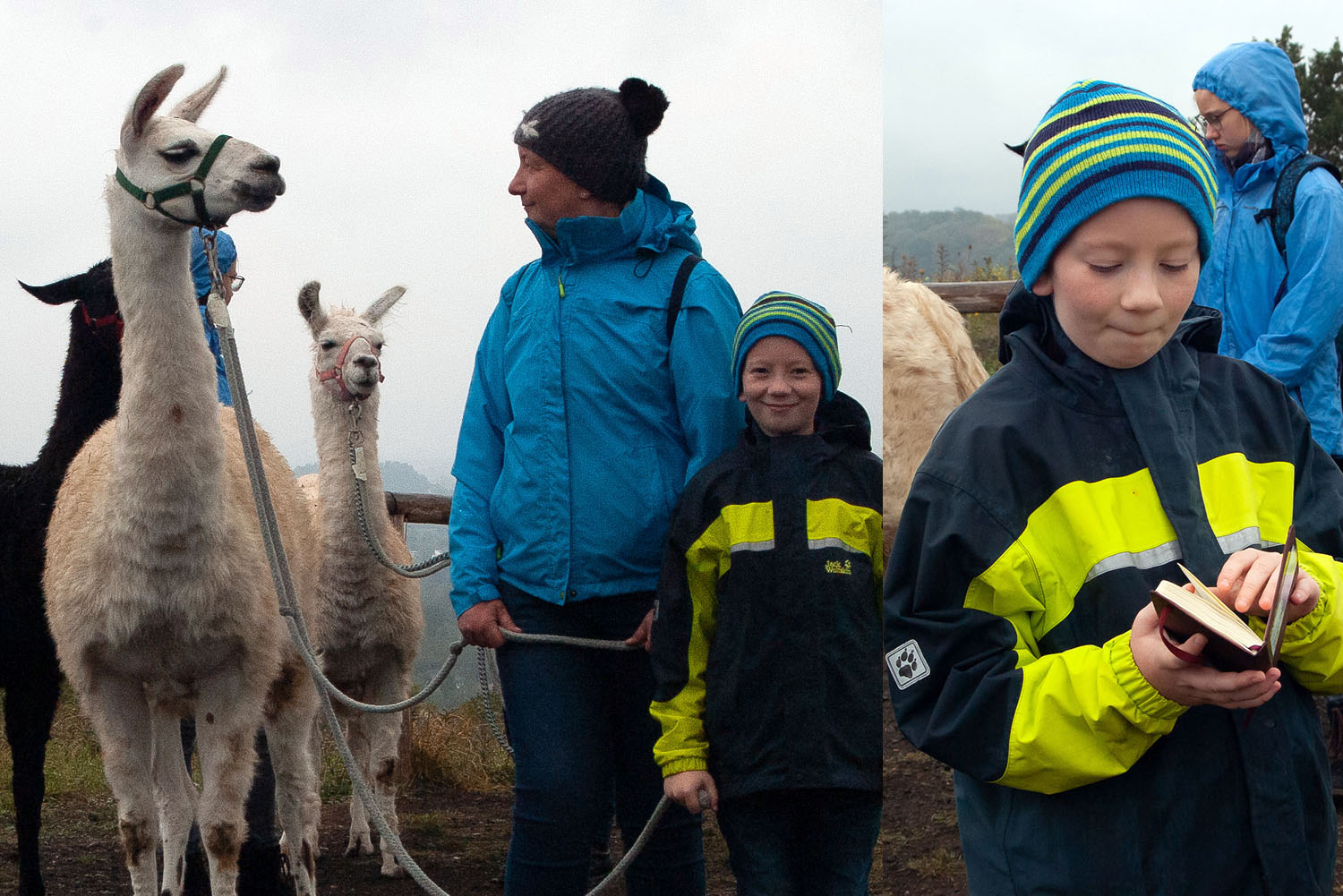 Die Freundin meiner Frau hatte an einem Samstag eine ca. 2-stündige Lama-Tour — ja, gemeint sind die (manchmal) spuckenden Anden-Kamele — organisiert. Wo die Pentax *istD L2 mit sollte, mit musste. Pünktlich zum Start des Rundgangs gab es feinsten Nieselregen, gemischt mit immer mal dicken Tropfen. Die ganze Tour, den ganzen Tag lang :-( Aufgeben? Nein! Ausgestattet mit dem Wissen aus 2015, dass die Pentax jenseits ISO 400 rauscht, aber durch Rohdatenformat und Lightroom ausreichend korrigierbar ist, wurde wetter- und lichtbedingt überwiegend mit ISO 800 und an dunklen Stellen mit ISO 1600 fotografiert. Wichtigstes Utensil war dabei die noch rechtzeitig gefundene und montierte Gegenlichtblende. Um die praktisch ungeschützt liegende Frontlinse des Zooms vor den Regentropfen zu schützen. Und die Ausbeute?