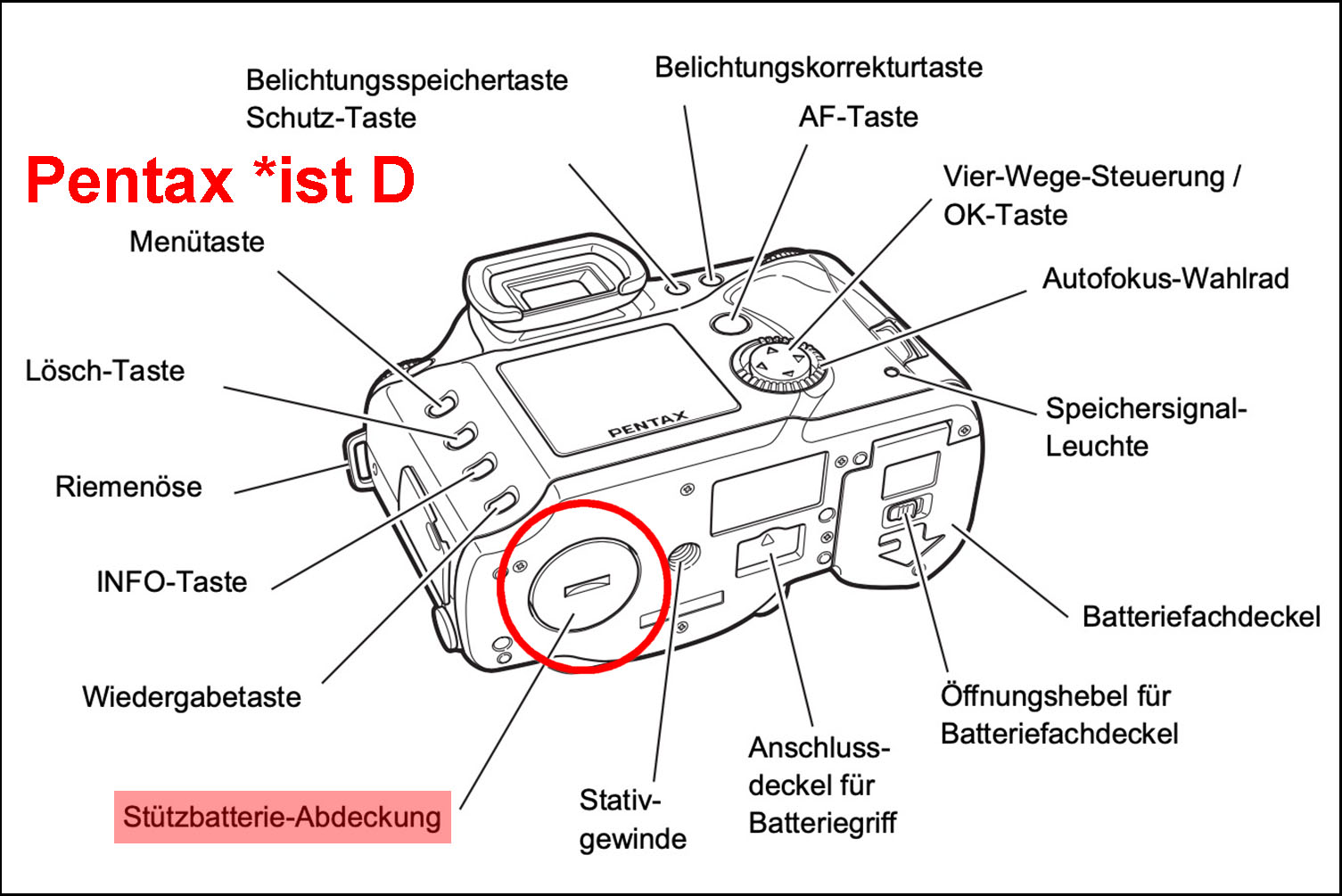 Eine unverzeihliche PENTAX-Macke und Schuld der Entwickler, Marketingleute: Das Weglassen der ausschließlich in der *ist D noch vorhandenen Pufferbatterie, die vom Fotografen problemlos selbst ausgewechselt werden konnte.