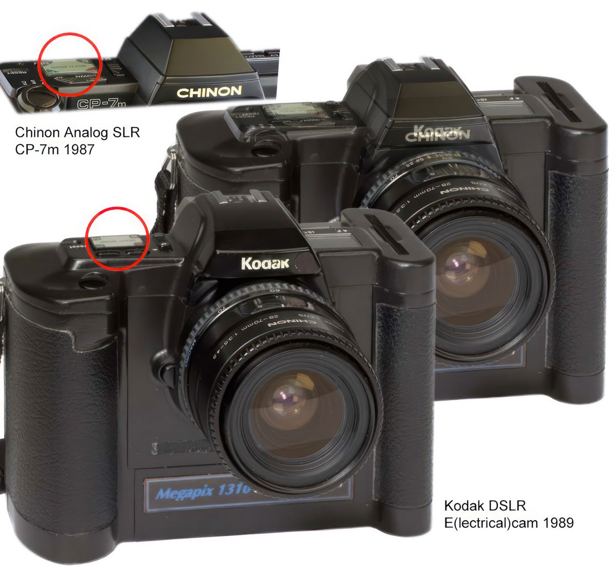 Es gab vor der 1991 in ca. 1000 Exemplaren gebauten Kodak DCS100 auf Basis der analogen Nikon F3 bereits Jahre vorher mehrere DSLR-Prototypen, Studien von Kodak. Perfekt gelistet in „The DCS Story – 17 years of Kodak Professional digital camera systems 1987 - 2004“ 1989 ist in der DCS-Story von einem Kodak Prototypen D-5000 oder ECAM zu lesen, der auf der CHINON CP-7m MULTI-PROGRAM basierte. Geworden ist es dann schließlich die Kodak DCS100 mit der Nikon F3 als Analogkamera-Basis.