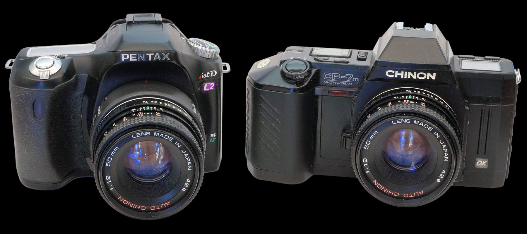 Warum taucht im Beitrag zu einer Pentax DSLR eine analoge Chinon SLR auf?