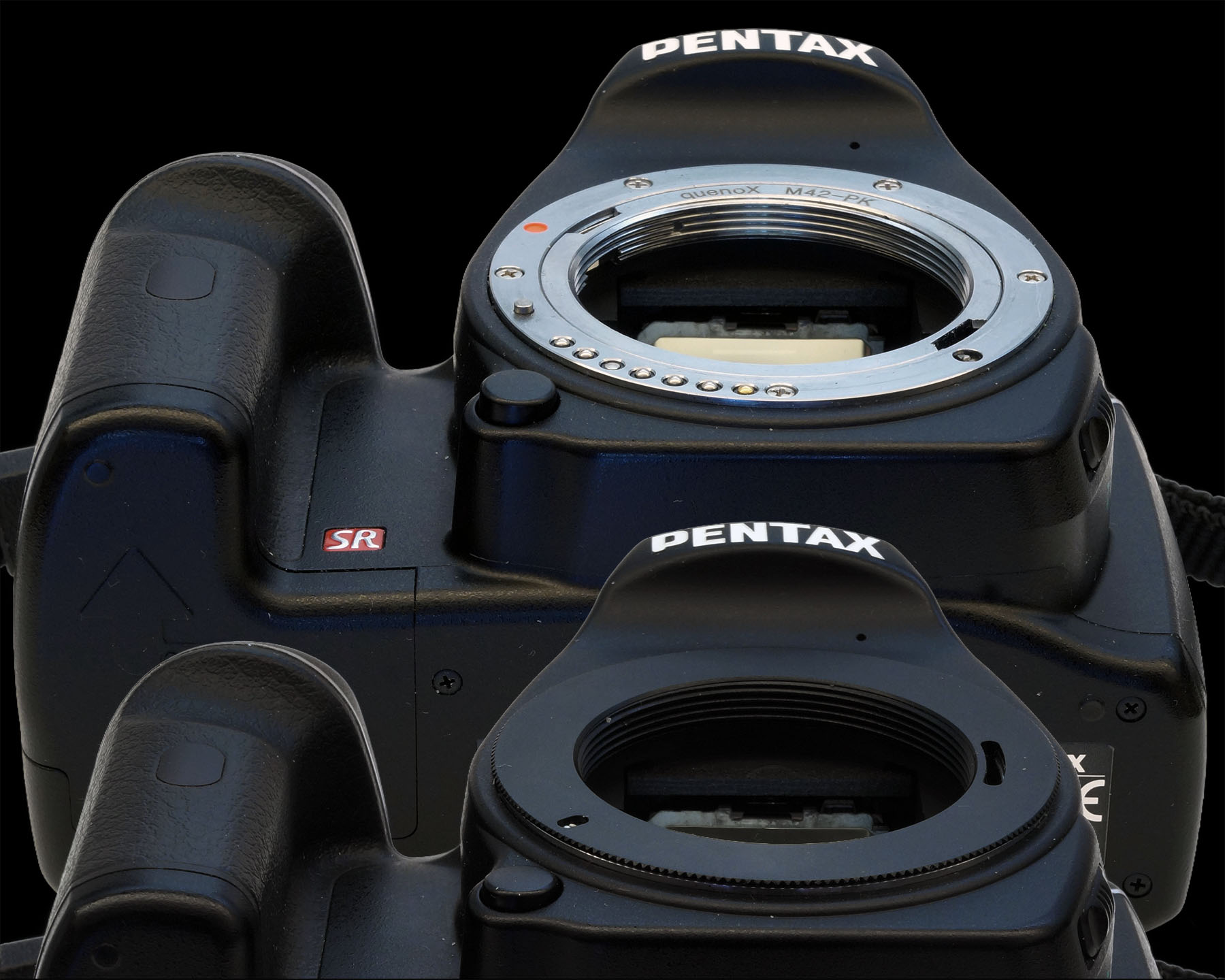 Der Adapter, der über den Flansch des K-Bajonetts rausragte – im Foto unten –, erwies sich bei 35 mm Brennweite sofort als "Zwischenring". Auch wenn es nur 0,85 mm sind — keine Unendlichfokussierung möglich. Beim Asahi Opt. Co. Super-Takumar 1:3.5 135mm das gleiche Negativergebnis! Erst andere zweite Adapter – im Foto oben –, der bündig im K-Bajonett verschwindet und rastet, erfüllt seine Aufgabe.