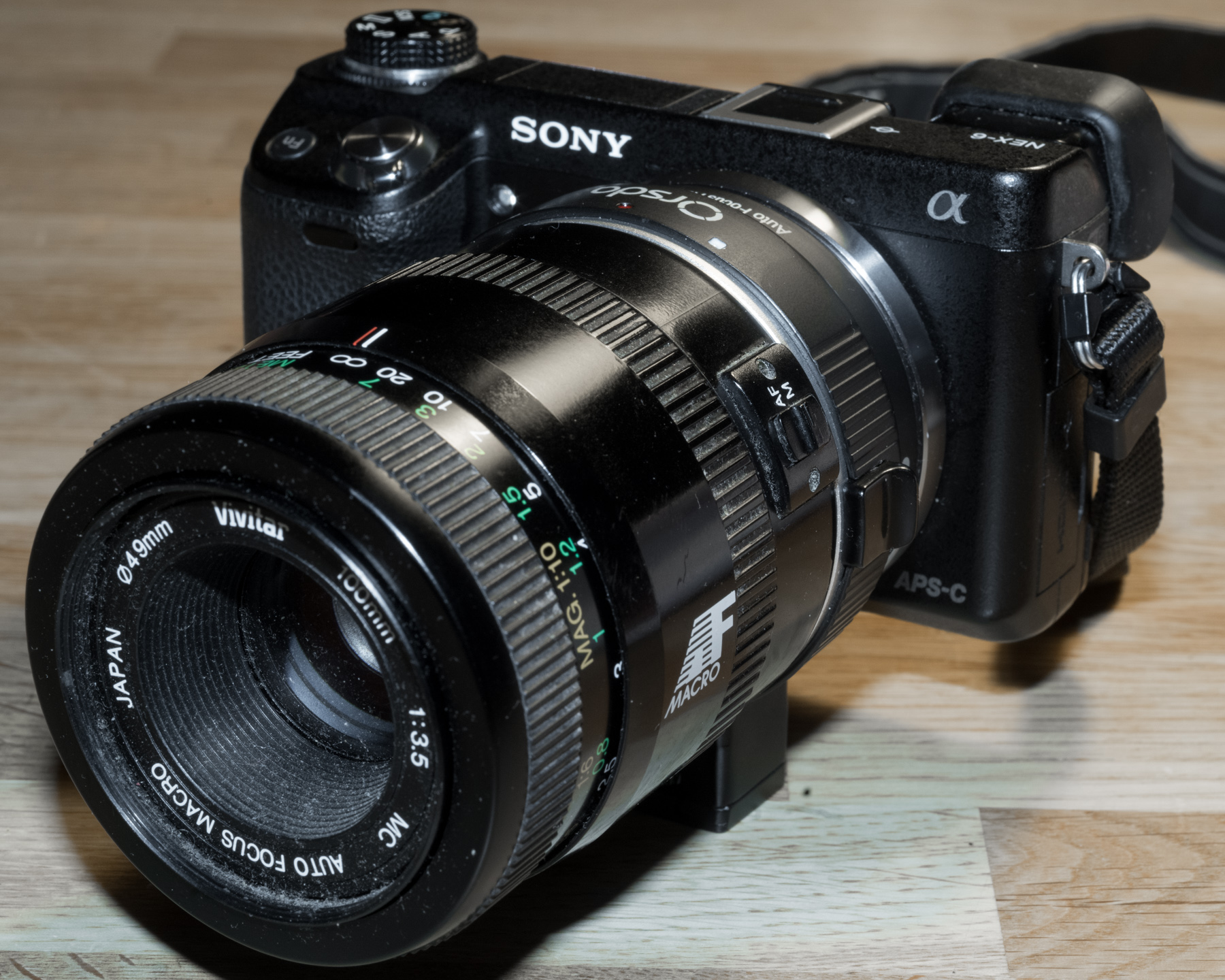 Bestehend aus der 16 Megapixel Halbformat Sony NEX-6, dem Orsda Auto Focus Adapter EF-NEX und dem 10 Euro Flohmarkt Vivitar 100mm 1:3.5 MC AUTO FOCUS MACRO mit Canon EOS-Anschluss. Das Vivtar reichlich wackelig und in Billig-Plastikbauweise und nicht wirklich funktionierendem Autofokus, aber es hat – manuell fokussiert – seinen Zweck erfüllt. Die einzige Kombination vor Ort, mit der ich die 24 x 36 mm PolaPan 35mm SW-Dias einigermaßen groß von der LED-Leuchtplatte ablichten konnte.