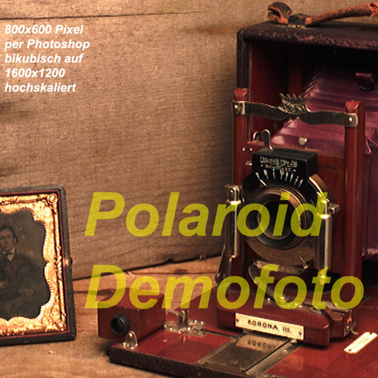 Zweites Bild: 800 x 600 Pixel Originalbild per Photoshop-Interpolationsart "bikubisch glatt" (zum Vergrößern) auf 1600 x 1200 Pixel hochgerechnet. Drittes Bild: 800 x 600 Pixel Aufname mit Polaroid-Software "PDC Studio Direct" auf 1600 x 1200 Pixel = 2 MP gebracht. Für mich ist die Polaroid-Software der Sieger! Und das Gesamtergebnis sieht auch besser aus, als die oben gezeigten Außenaufnahmen, ja vielleicht sogar besser als das Polaroid-Demofoto...