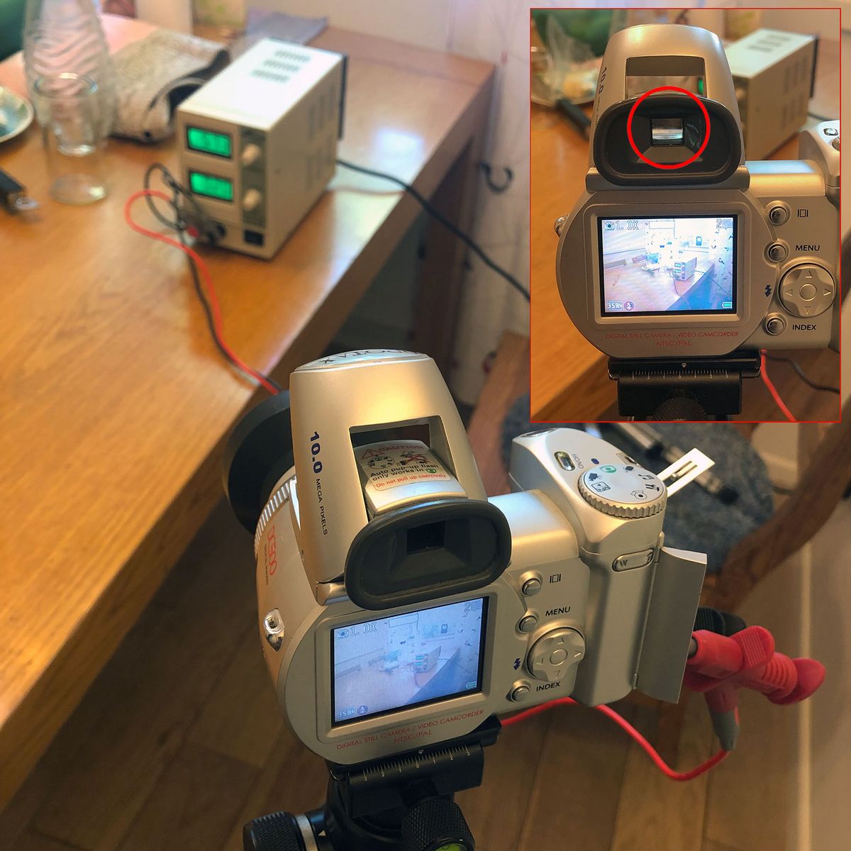 Etwas fummelig, mit dem Labornetzteil und den Krokodilklemmen im Akkuschacht der Protax, aber funktionierend. Und nach Start der Protax, Ausfahren des Objektivs und Hochfahren des Blitz', eröffnete sich gleich der nächste Betrug: Was sich da wie ein E-Sucher tarnt, ist nur ein eckiges Guckloch …