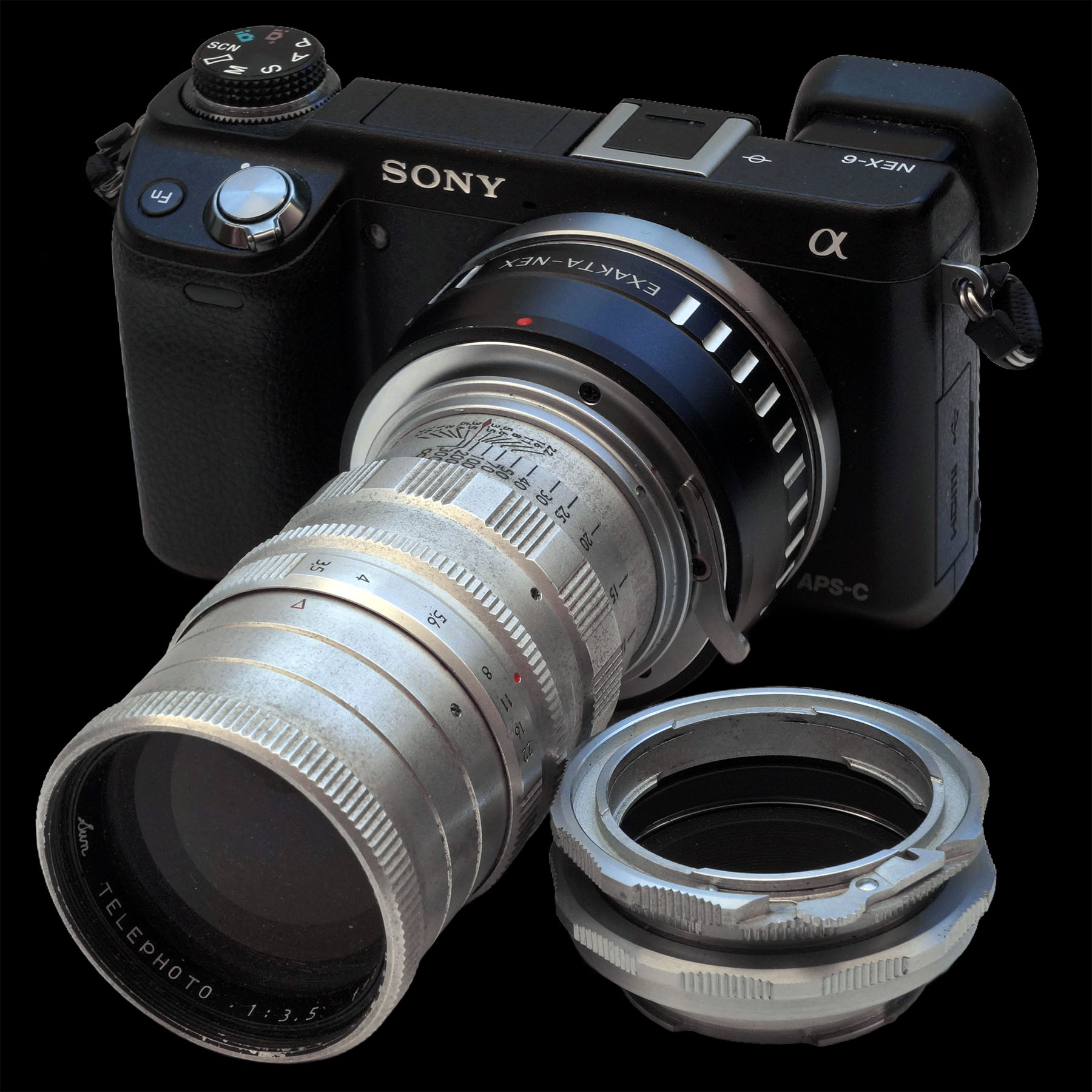 Es hat lange gedauert, bis 135 mm Teleobjektive bessere Naheinstellungen Richtung 1-1,3 m (und kürzer) bekamen. Bereich von 1,5 bis 1,8 m der alten 135er erwiesen sich oft als zu lang. Simple Abhilfe: Ein kleiner Satz für den jeweiligen Objektivanschluss passende Zwischenringe. Alternativ geht natürlich auch ein Helicoid mit Einstellschnecke. In diesem Fall mit im Foto abgebildet: Zwischenringe mit Exakta-Bajonett. Typische Flohmarktware ;-)