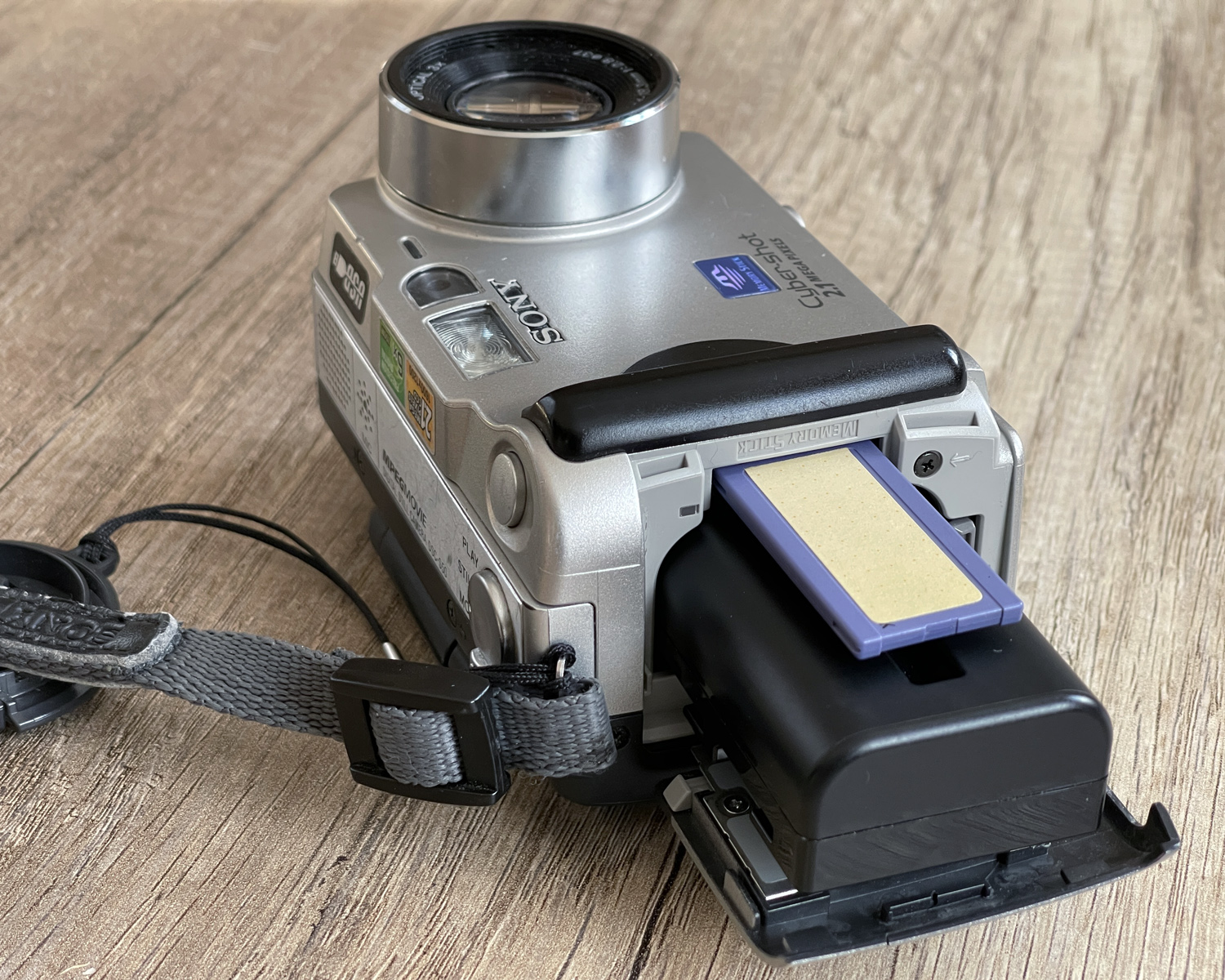 Akkufach und Speicherkartenfach sind zusammengefaßt, benutzt wird der nur von Sony verwendete MemoryStick in der ersten Version, die bis 128 MB erhältlich war.