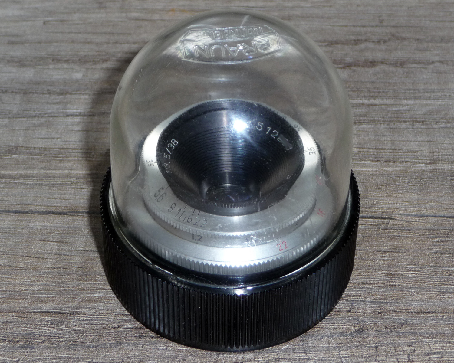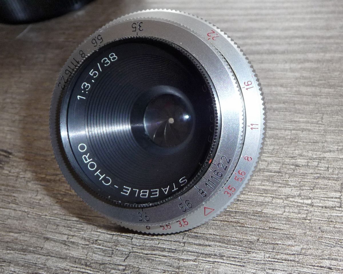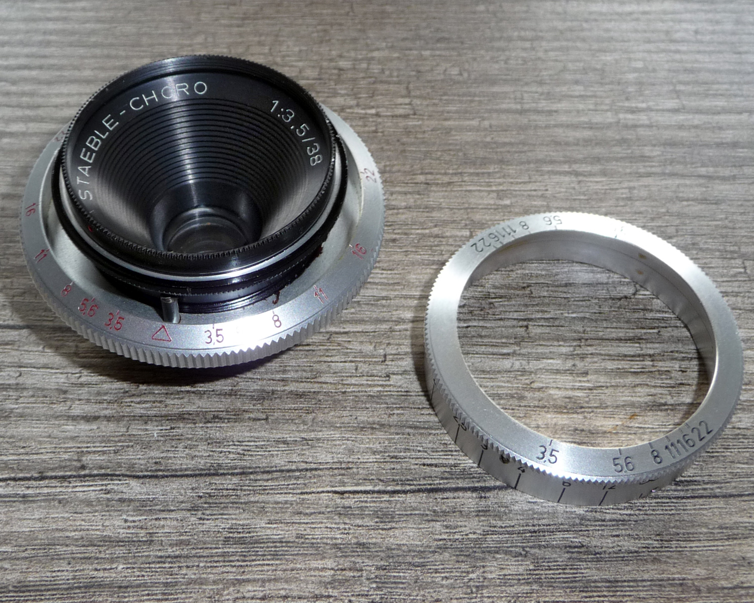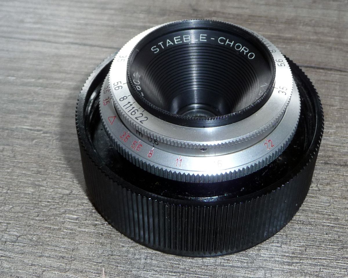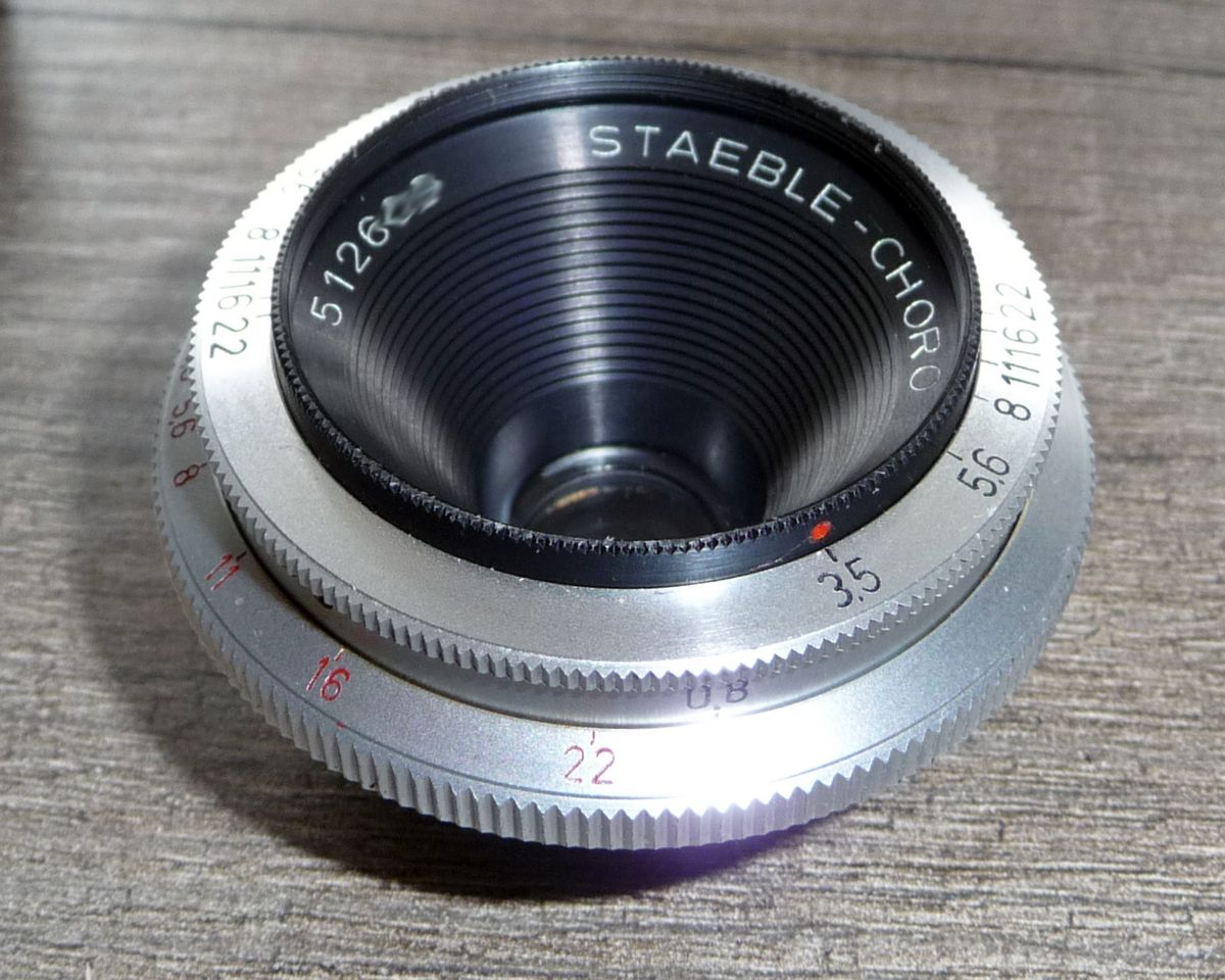 Staeble hat im Laufe der Jahre Objektive für viele andere Firmen hergestellt, teilweise unter eigenem Namen, aber auch oft mit der Kundenbezeichnung gelabelt. So stammen beispielsweise fast alle Novoflex-Objektive von Staeble. Das hier gezeigte Weitwinkel entstand für die Carl Braun Nürnberg Paxette II, eine Meßsucherkamera mit M39-Schraubgewinde, die aber ein anderes Auflagemaß als die Schraubleicas hat, denn die Paxette benötigt Platz für ihren Zentralverschluß, während die Leica einen Gummituch-Schlitzverschluß hat.