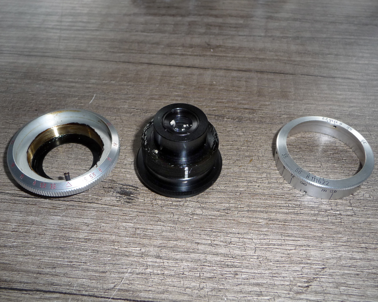Wie man sieht, wurde das Objektiv recht einfach konstruiert: Die M39-Fassung trägt innen ein Feingewinde zum Fokussieren, die Linsenfassung hat Außen das Gegenstück, die Friktion entsteht durch das Schmierfett und der Entfernungsanschlag ist ein eingeschraubter Gewindestift. Einfach, preiswert, funktionell! Das Zerlegen der Blenden- und Linsenbaugruppe ist wesentlich aufwendiger, beim Zusammenbau der Blendenlamellen ist feinmechanisches Geschick erforderlich.