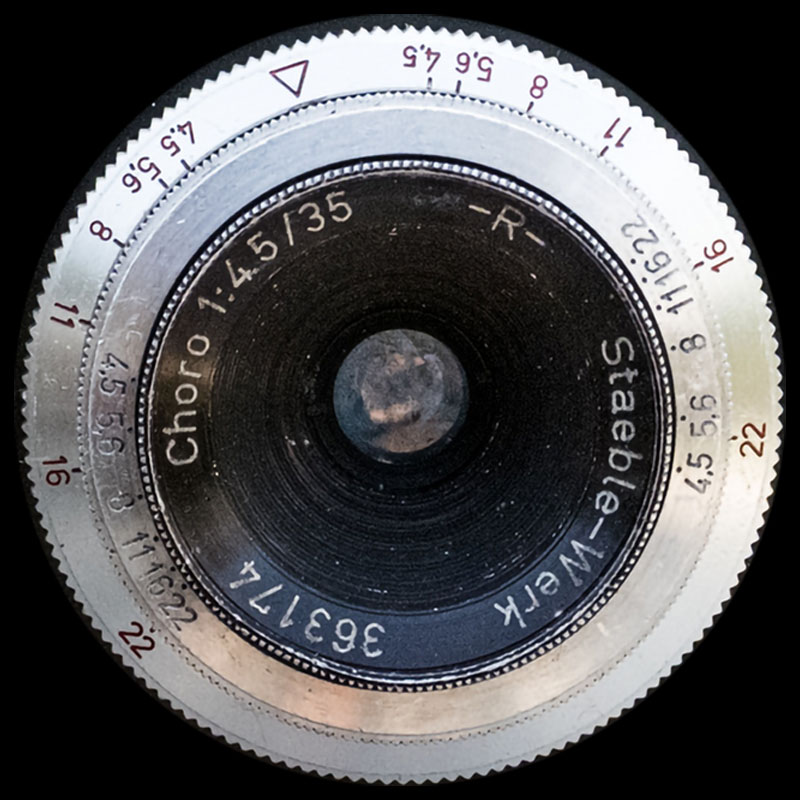 Das Choro ist ein dreilinsiges einfachvergütetes Objektiv. Das 35er leuchtet den für Kleinbild nötigen Bildkreis nicht ganz aus, das 38 hingegen schon. Während beim 35er Choro deshalb die Bildecken heftig vignettieren, ist das 38er wesentlich gefälliger, was Randabdunklung und Eckunschärfe angeht. Allerdings muß immer bedacht werden, daß heutige Vollformatsensoren die Auflösung der Kleinbildfilme von 1950 erheblich übersteigen, damals hatte ein niedrigempfindlicher Film (25-50 ASA) weniger Auflösung und mehr Korn als heutzutage ein 100-ASA-Film. Bei den damals üblichen Vergrößerungen von 7x9 bis meist nur 13x18 cm reichte ein solch einfaches Objektiv völlig aus.