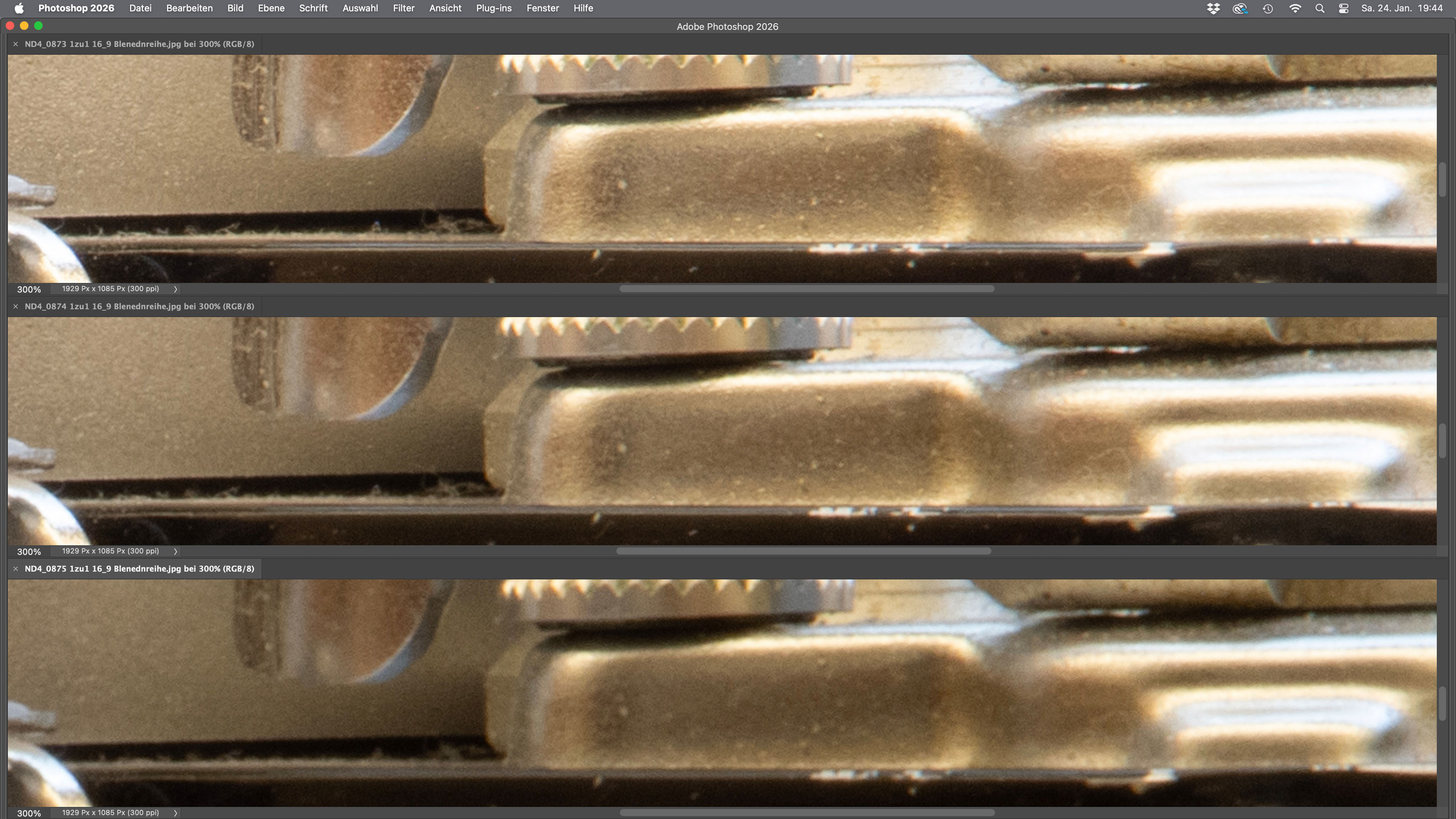 Wenn ich dann zum Gewinn an Schärfentiefe statt zu starkem Abblenden beim Fokus-Stacking ein Nahpunkt für den Fokus, einen mittleren Punkt und den am weitesten entfernten Messpunkt fokussiere, hat das Objektiv im Vergleich zu "normalen" Objektiven mit Entfernungseinstellung immer eine geringfügig andere Position, die sich auch aufs Motiv auswirkt. Wieweit das das Photoshop-Fokus Stacking ausgleichen kann, habe ich nicht probiert.