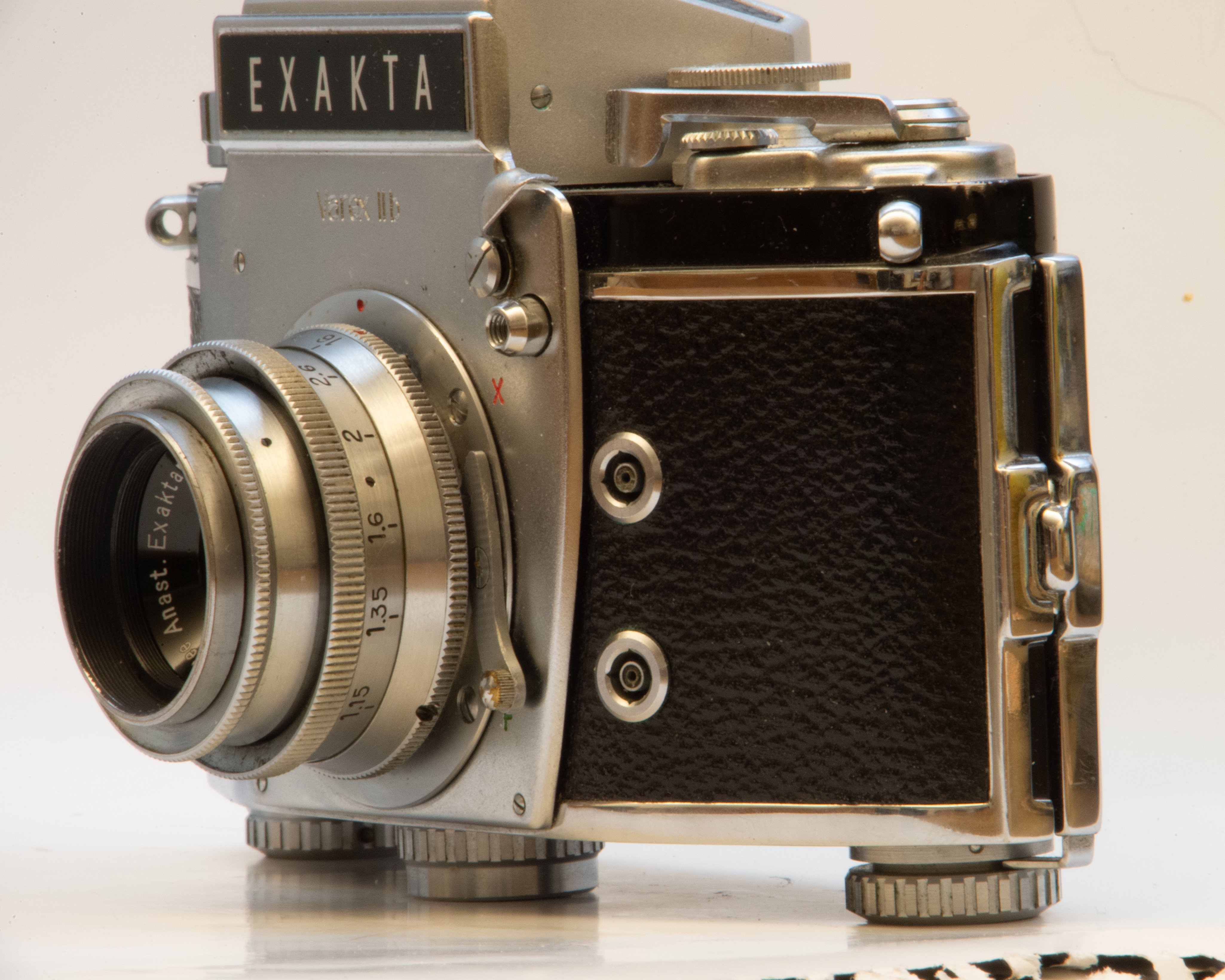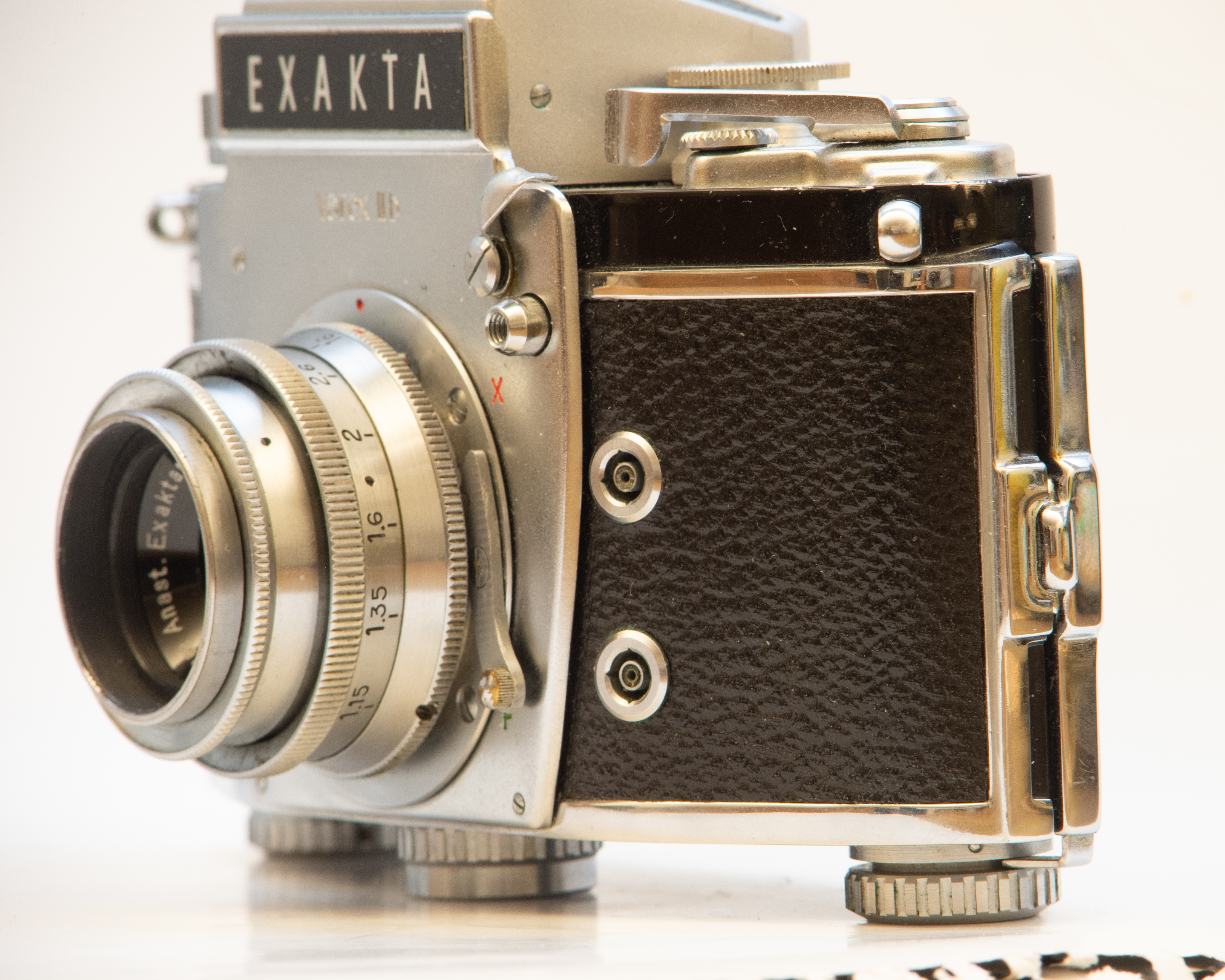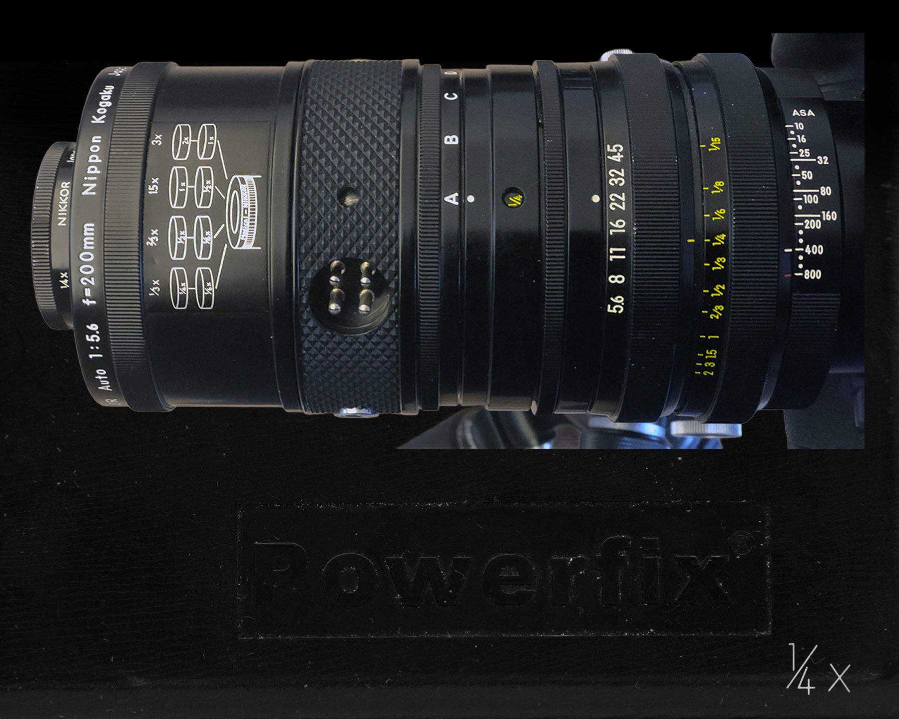 Im Gegensatz zu diesen beiden ersten Fotos habe ich zunächst auf die Nikon Z 6 und das wenig stabile Balgengerät mit Nikon F-Anschluss verzichtet und das Medical Nikkor im ersten Durchgang direkt auf die 16 Megapixel Vollformat DSLR Nikon D4 montiert. Um die alte Exakta so gut wie möglich ins Bildfenster einzupassen, kam die 1/4 Vorsatzlinse zum Einsatz. Die laut Tabelle für eine Distanz von 0.89 m gerechnet ist. Die 1/6 ist für 1,34 m.