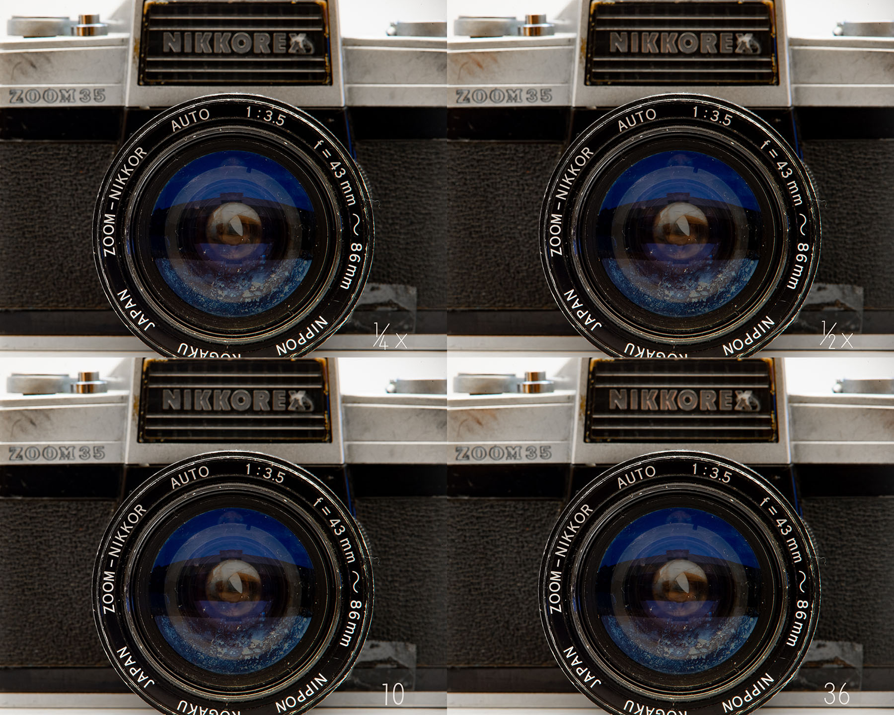 Die eingesetzte 24 Megapixel Vollformat Nikon Z6 hat auf dem Sensor einen Pixelabstand/Pixelpitch von 5,9 µ. Nach Theorie beginnt die Beugungsunschärfe beim Produkt Pixelpitch x 2, also 5,9 x 2 = Blende f/11,8. Nach den Erfahrungen gehen auch f/16 noch problemlos. Und wenn ich mir die Dreiervergleiche ansehe, würde ich sogar noch f/22 nehmen. Danach ist Schluss. Bei genauem Hinsehen verschwinden feinste Details. Auf keinen Fall auf f/32 oder gar f/45! abblenden. Was analog noch funktionierte. Und wenn f/16 f/22 nicht reichen, um das Motiv komplett scharf abzubilden bleibt theoretisch nur der Weg über Fokus-Stacking. Ein aus mehreren unterschiedlich fokussierten Einzelfotos zusammengerechnetes Foto. Was bei dem Medical Nikkor aufgrund seiner Bauweise nicht wirklich zufriedenstellend durchfürbar ist. Und natürlich nur bei unbewegten Motiven vom Stativ aus funktioniert. Siehe auch: "Nikon Z6/7 Fuji X-E1 mit Tokyo Kogaku Japan RE Auto-Topcor 1:3:5 f=13,5 cm, Schnelltest".