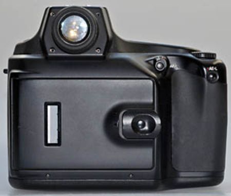 Die Kamera hat bereits ohne Objektiv eine gewaltige Gehäusetiefe und mit über 1,7 kg auch ein ziemliches Gewicht. Die Rückwand ist fast komplett „nackt“, weil fast alle Bedienelemente auf der Kameraoberseite untergebracht wurden. Dort sitzt auch ein großzügiges Statusdisplay. Auf einen Bildschirm zur Kontrolle der aufgenommenen Bilder muss man aber verzichten.